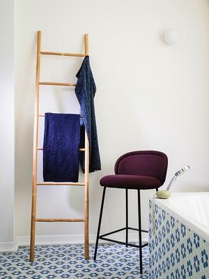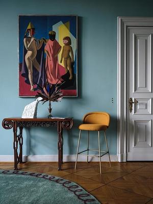 Sebastian Herkner schuf mit Ona einen eleganten Barhocker. Die feste Polsterung und das klare Design vermitteln Ruhe. Der große Keder ist typisch für die Ona Serie.