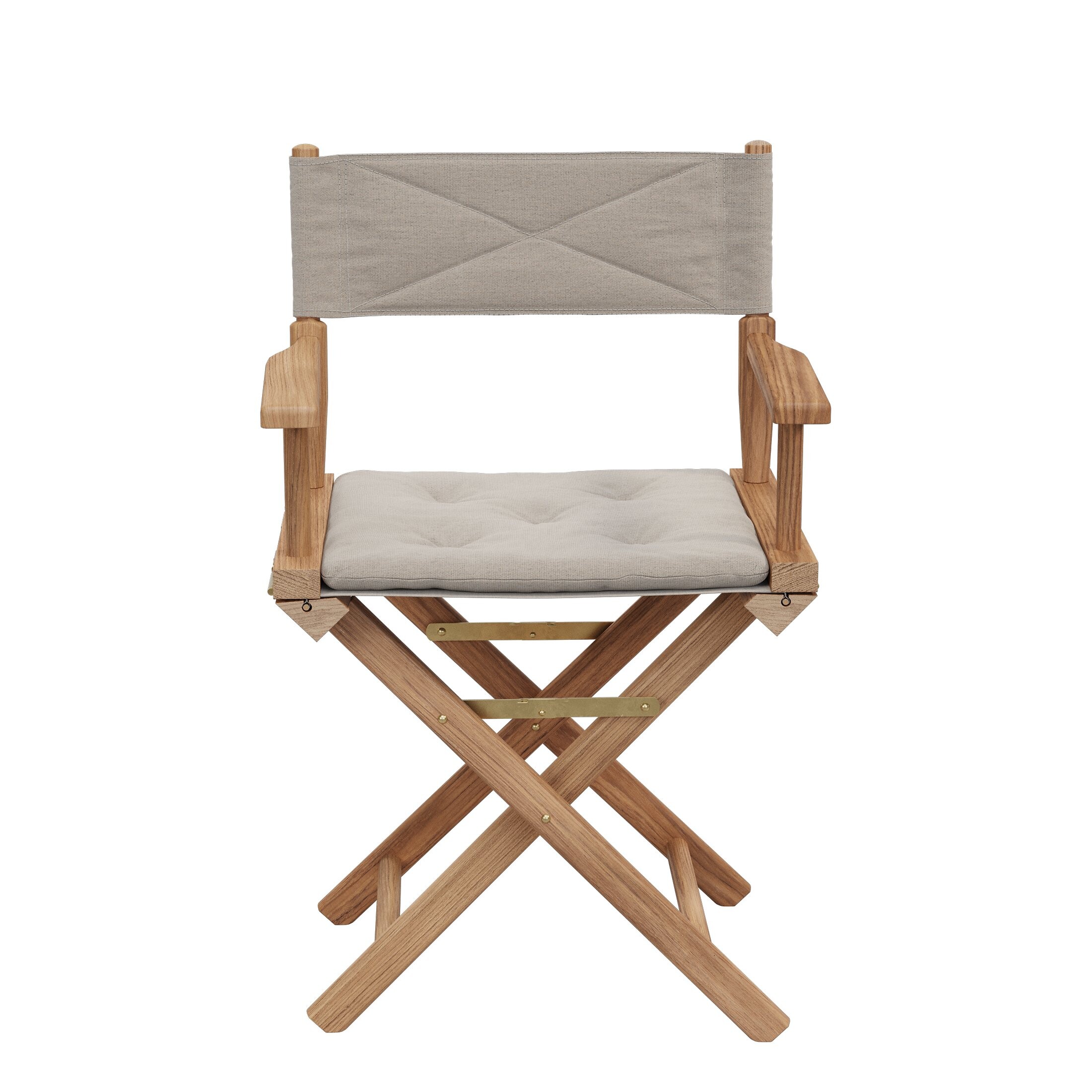 Das klappbare Gestell aus Teak (FSC™ 100%) ist für den Einsatz im Freien ausgelegt. Sichtbare Beschläge aus Messing setzen einen ruhigen Akzent. Da das Segeltuch nicht witterungsbeständig ist, sollte der Regiestuhl nachts nicht im Freien bleiben.