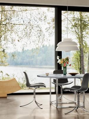 Die Concert™-Hängeleuchte von Jörn Utzon sorgt für angenehmes, blendfreies Licht, ohne Kompromisse bei der Beleuchtungsstärke einzugehen. Die Leuchte besteht aus vier Schirmen und einem parabolförmigen Reflektor aus gezogenem Stahl, der an der Glasaufhängung für die satinierten Glasschirme befestigt ist.