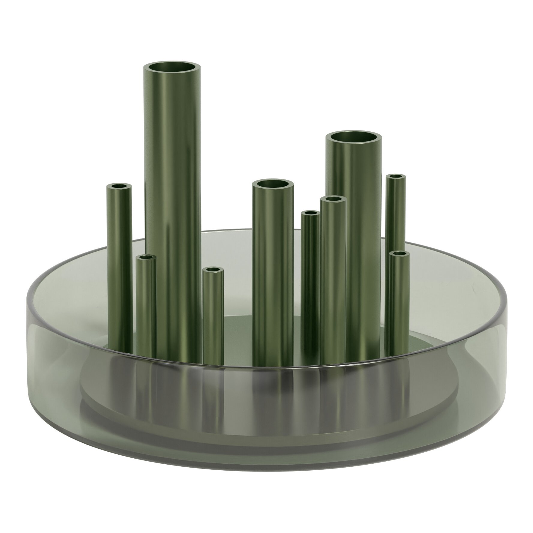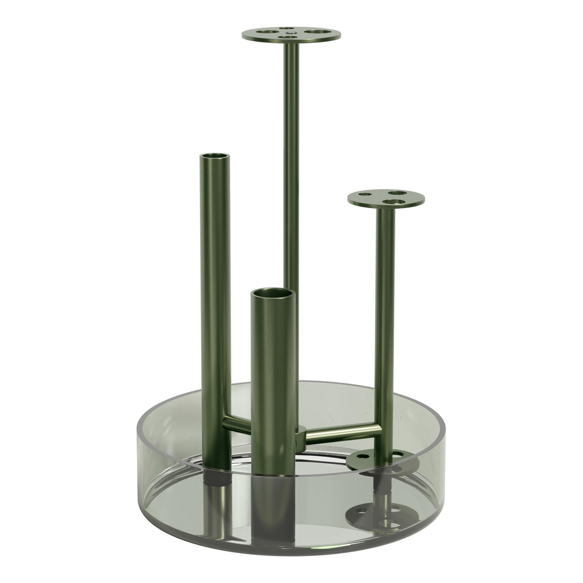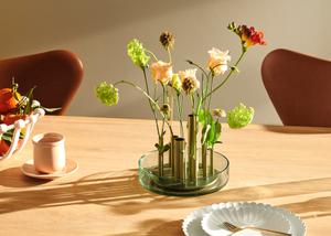 Auch bei den Vasen Ikeru ließ sich Jaime Hayon von der japanischen Ikebana Kunst inspirieren. Metallflöten halten einzelne Blumen, die so wie ein Kunstwerk arrangiert werden können. Wasser in der Glasschale hält die Blumen und Halme frisch.
