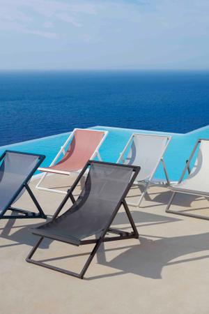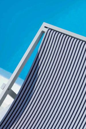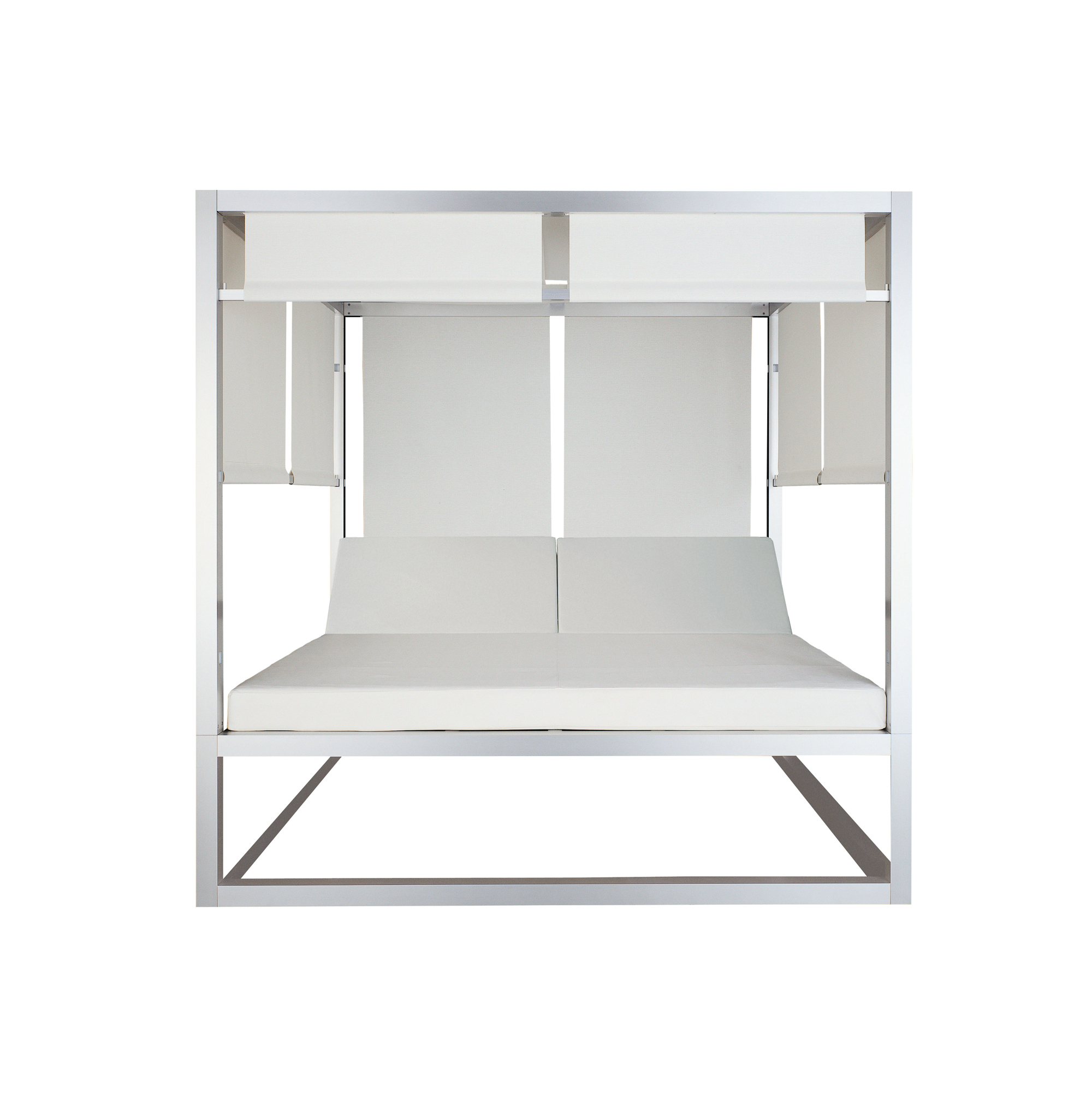 Das erhöhte Daybed ist ein 60 cm vom Boden abgehobenes Tagesbett aus eloxierten oder thermolackierten Aluminiumprofilen in den Farben Weiß, Achatgrau, Zementgrau, Weinrot, Sand, Bronze oder Anthrazit und ist mit Soltis, einem Kunststoffgewebe, bezogen. Die Rückenlehne ist neigbar. Die Kissen und Sitzpolster sind aus Polyurethanschaumgummi und mit wasserabweisendem Stoff bezogen. Die abnehmbaren Bezüge sind in verschiedenen Ausführungen und Farben erhältlich.