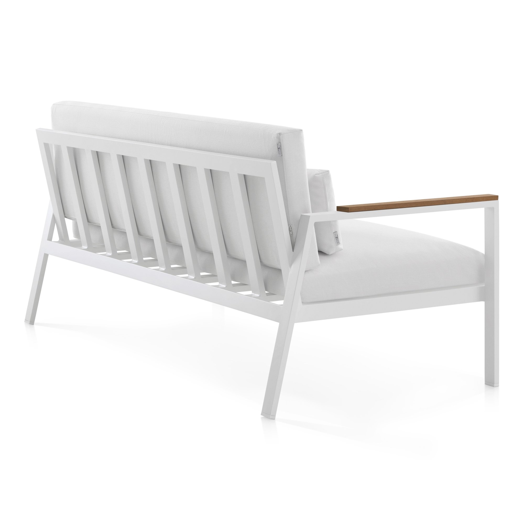 Das 2-Sitzer Sofa Timeless vervollständigt die Kollektion. Es ist ein Outdoor-Sofa aus pulverbeschichteten, geschweißten Aluminiumprofilen, das in vielen Farbvarianten und mit Teakholz-Akzenten erhältlich ist. Die Matten und Kissen sind aus Polyurethanschaumgummi und mit einem wasserfesten Stoff überzogen. Die für den Außenbereich geeignete Polsterung ist abnehmbar, und Sie können sie individuell gestalten, indem Sie aus den vielen verschiedenen Textilien wählen, die in unserem Katalog erhältlich sind.