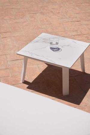 Das rationalistische Design des runden Beistelltisches Timeless ergänzt die Liegen der Kollektion. Er ist aus geschweißten Aluminiumprofilen gefertigt. Die Platte des Tisches für den Außenbereich kann aus Phenolharzplatten oder aus dem extrem widerstandsfähigen Material Dekton® von Cosentino hergestellt werden, die beide bei der Verwendung im Freien extrem haltbar sind. Sie können ihn ganz nach Ihren Wünschen gestalten, denn es gibt zahlreiche Optionen für die Oberflächenbehandlung und die Farben, die dem Tisch einen einzigartigen Look verleihen.