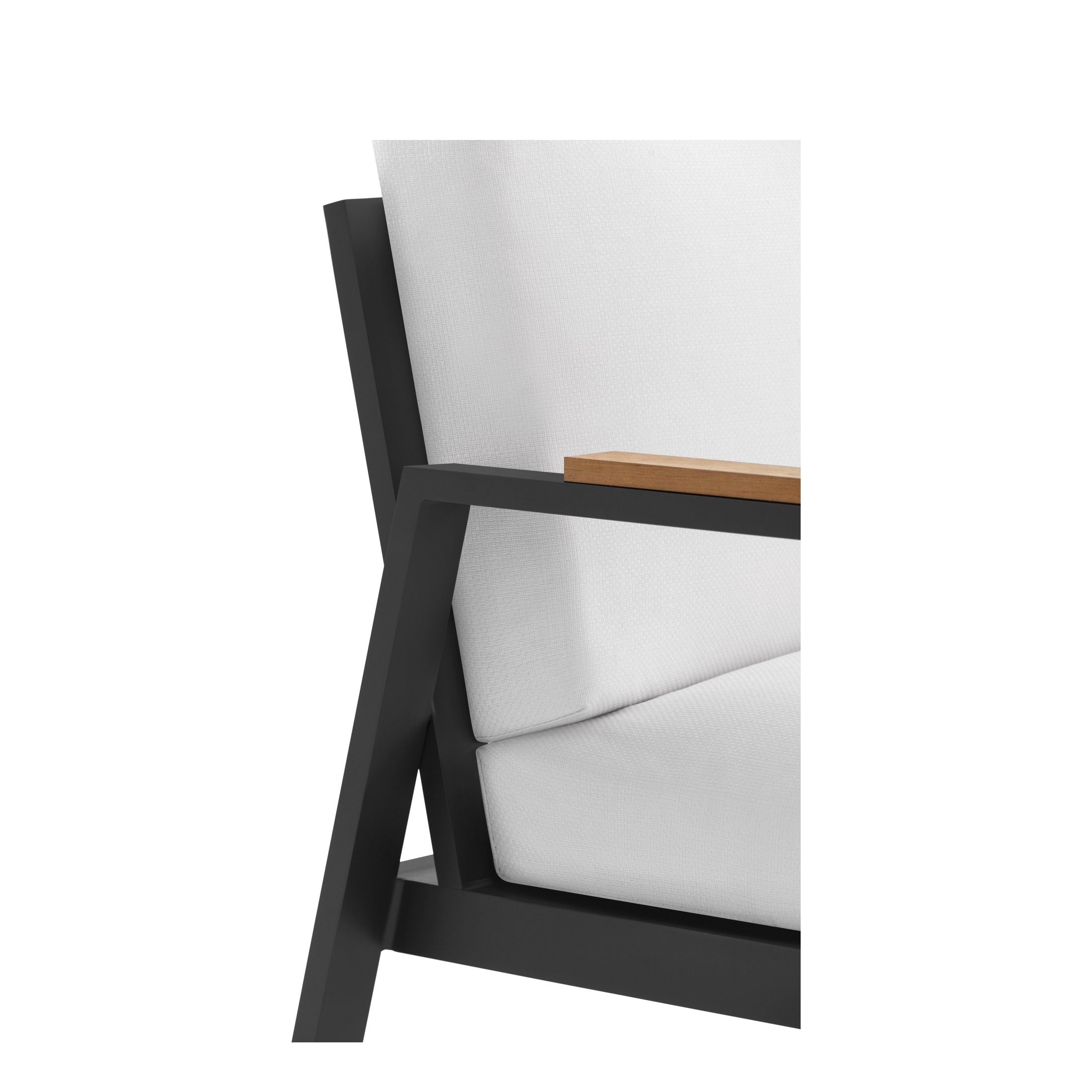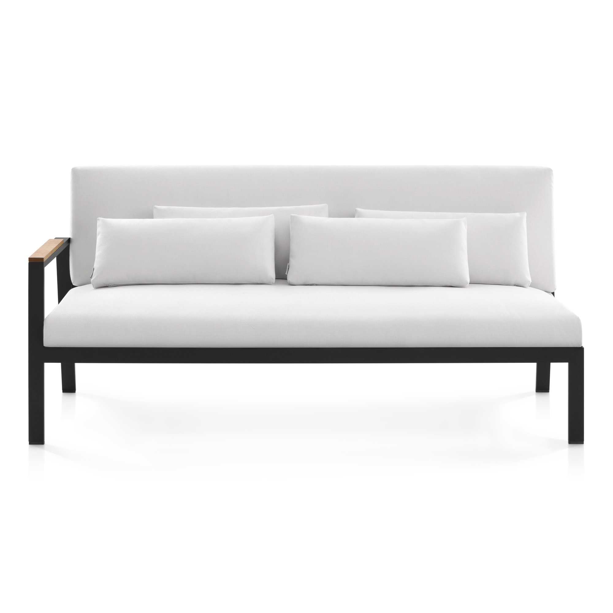 Das Sofa-Modul Timeless 1 ist ein Designersofa, das von einer geschweißten und pulverbeschichteten Aluminiumstruktur umrahmt wird, die in verschiedenen Farbvarianten erhältlich ist. In Kombination mit der großen Auswahl an Outdoor-Polstern ist dieses Outdoor-Sofa ein vielseitiges Möbelstück, das sich sowohl für den Objekt- als auch für den Wohnbereich eignet. Die Armlehne kombiniert Aluminium mit Teakholz.