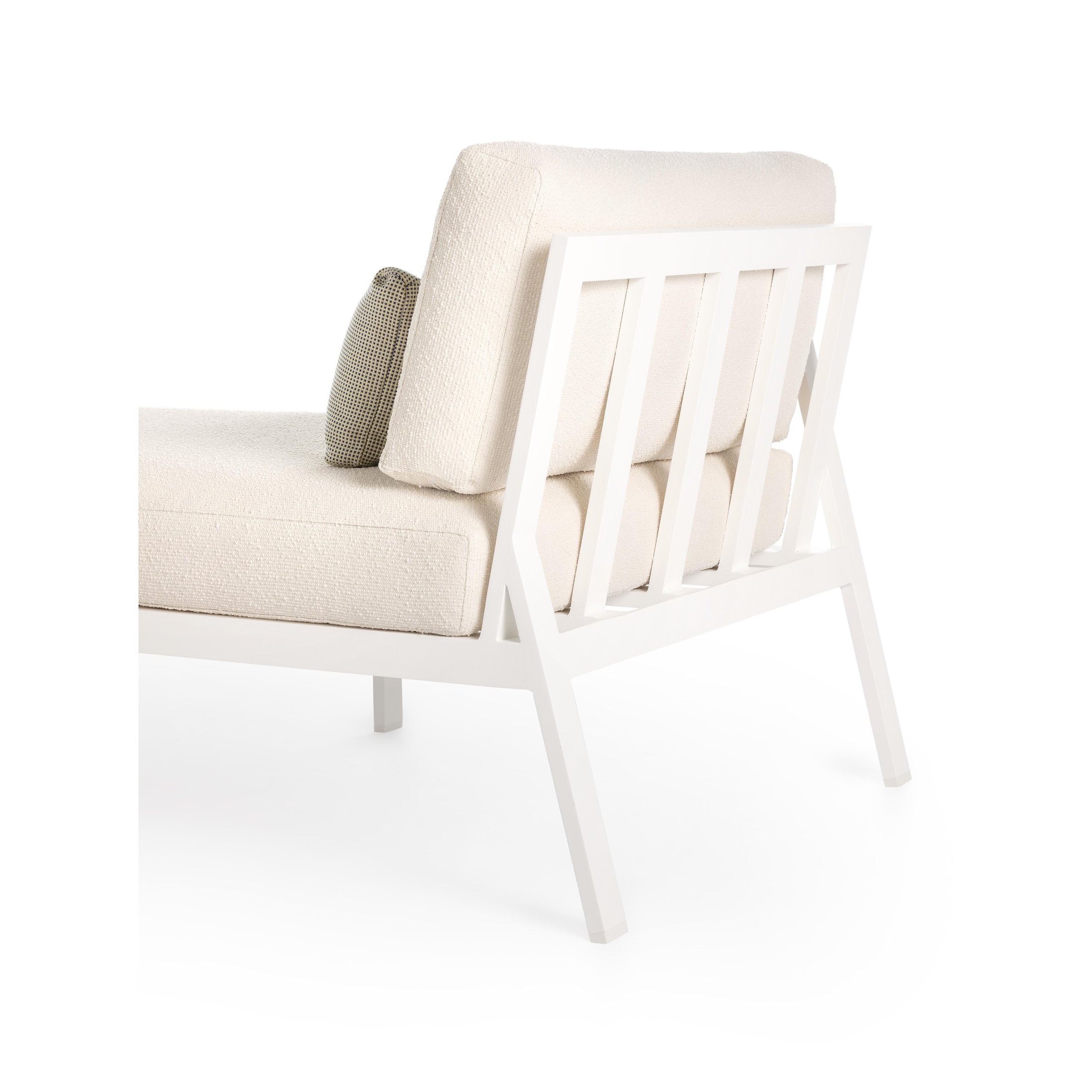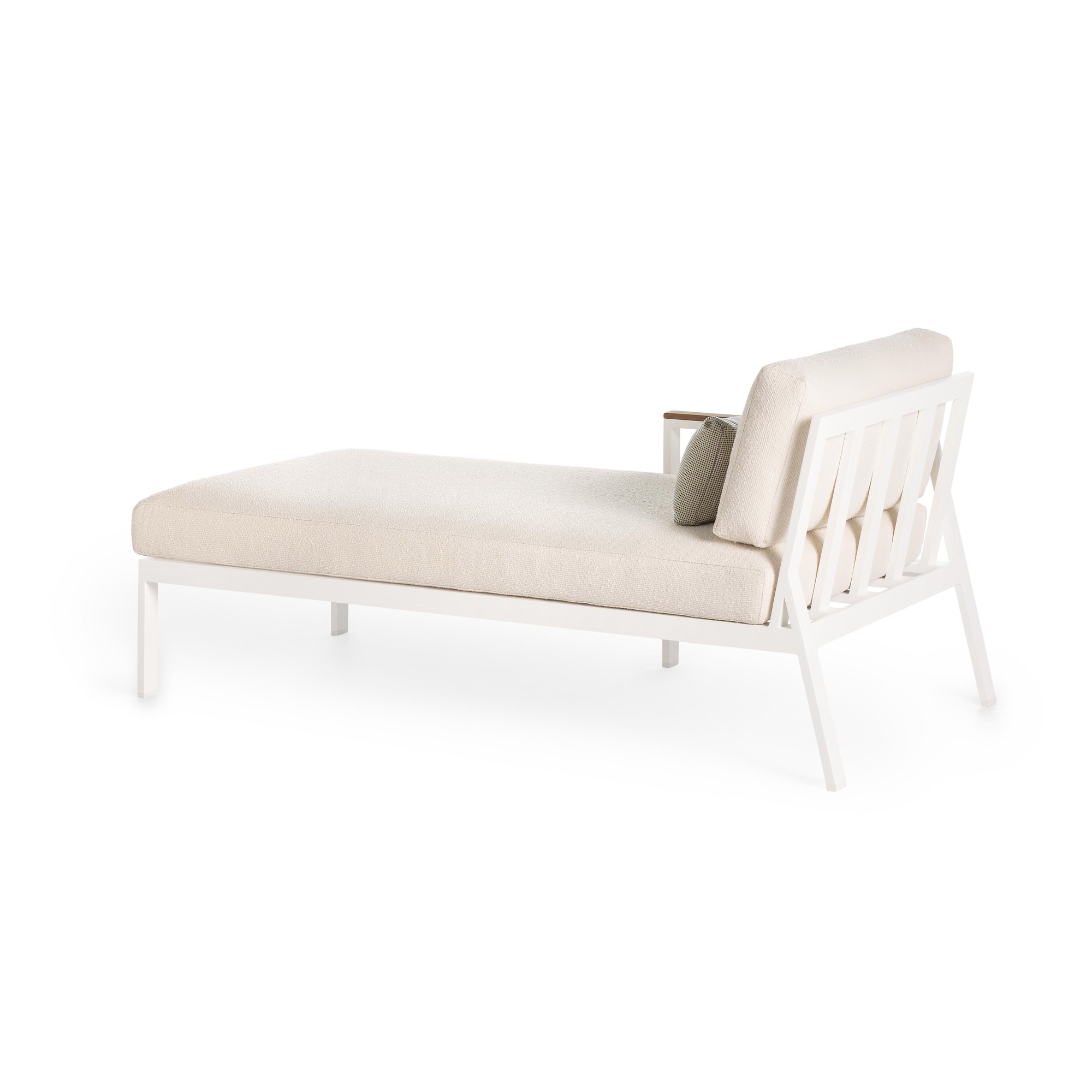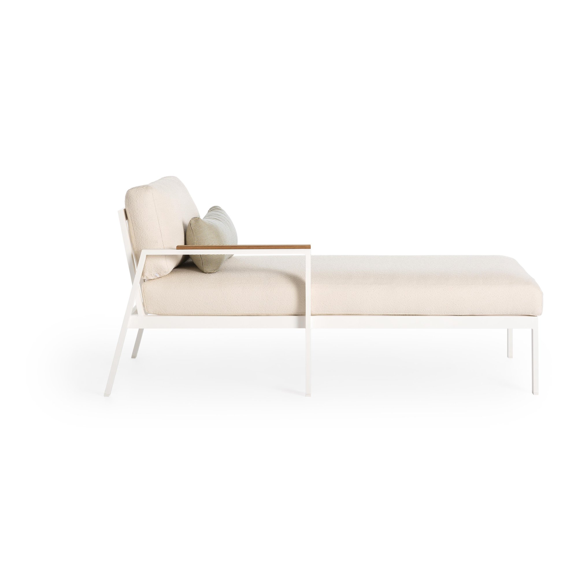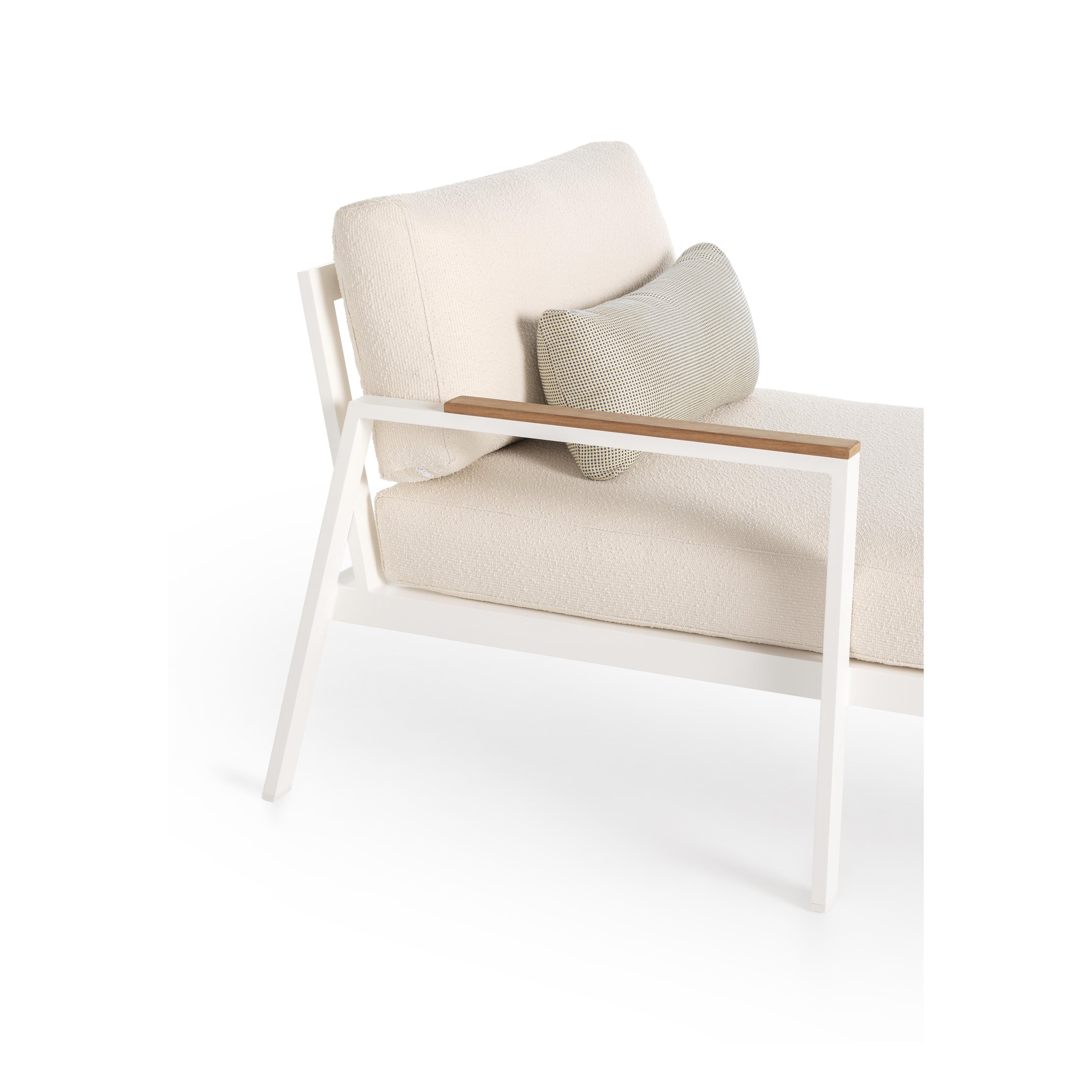 Das Sofa-Modul Timeless 2 vervollständigt die Kollektion. Die Struktur dieses Designersofas besteht aus geschweißten Aluminiumprofilen, auf denen die Matten und Kissen ruhen, die mit einem Bezug Ihrer Wahl versehen sind. Die Armlehne wird durch Teakholz dezent betont.