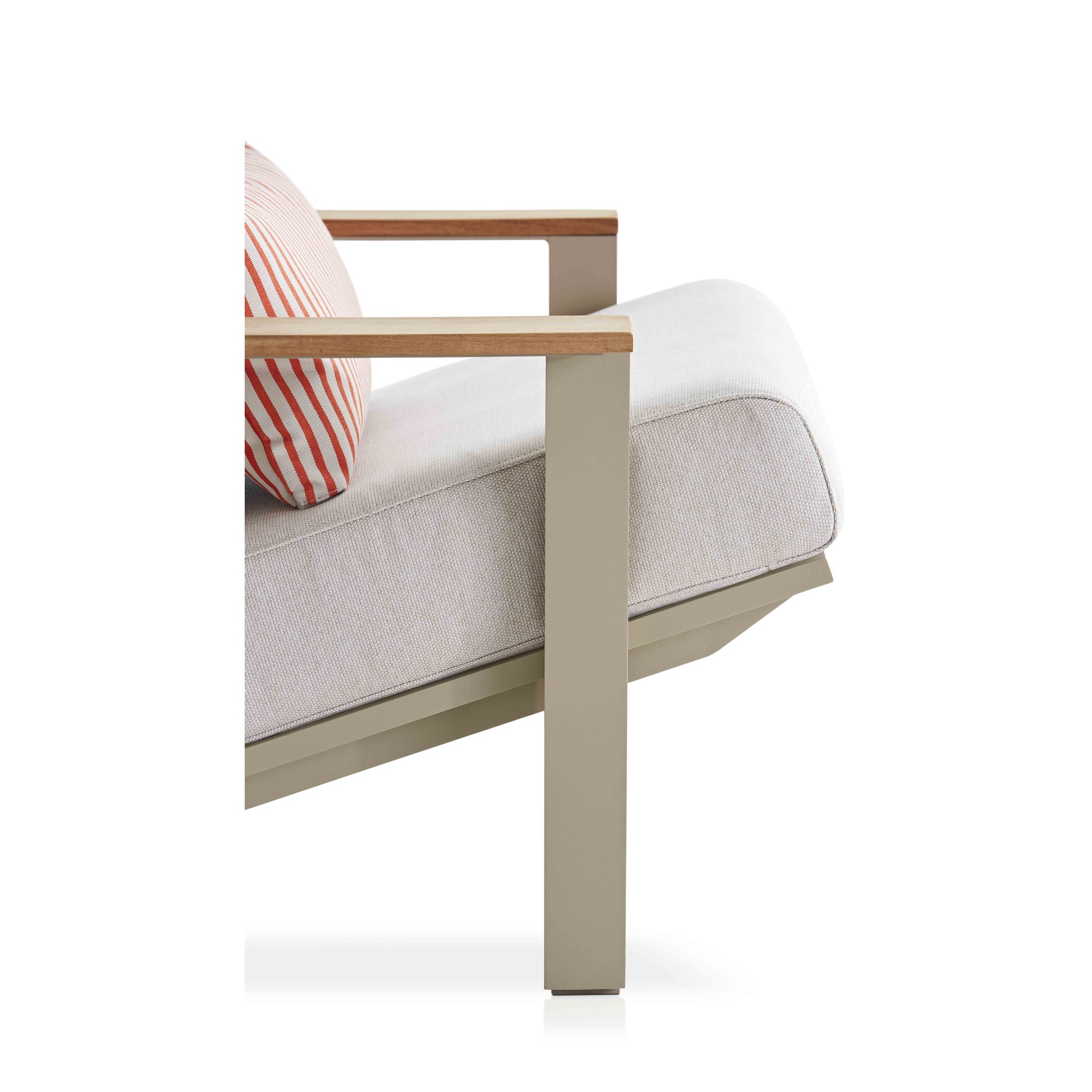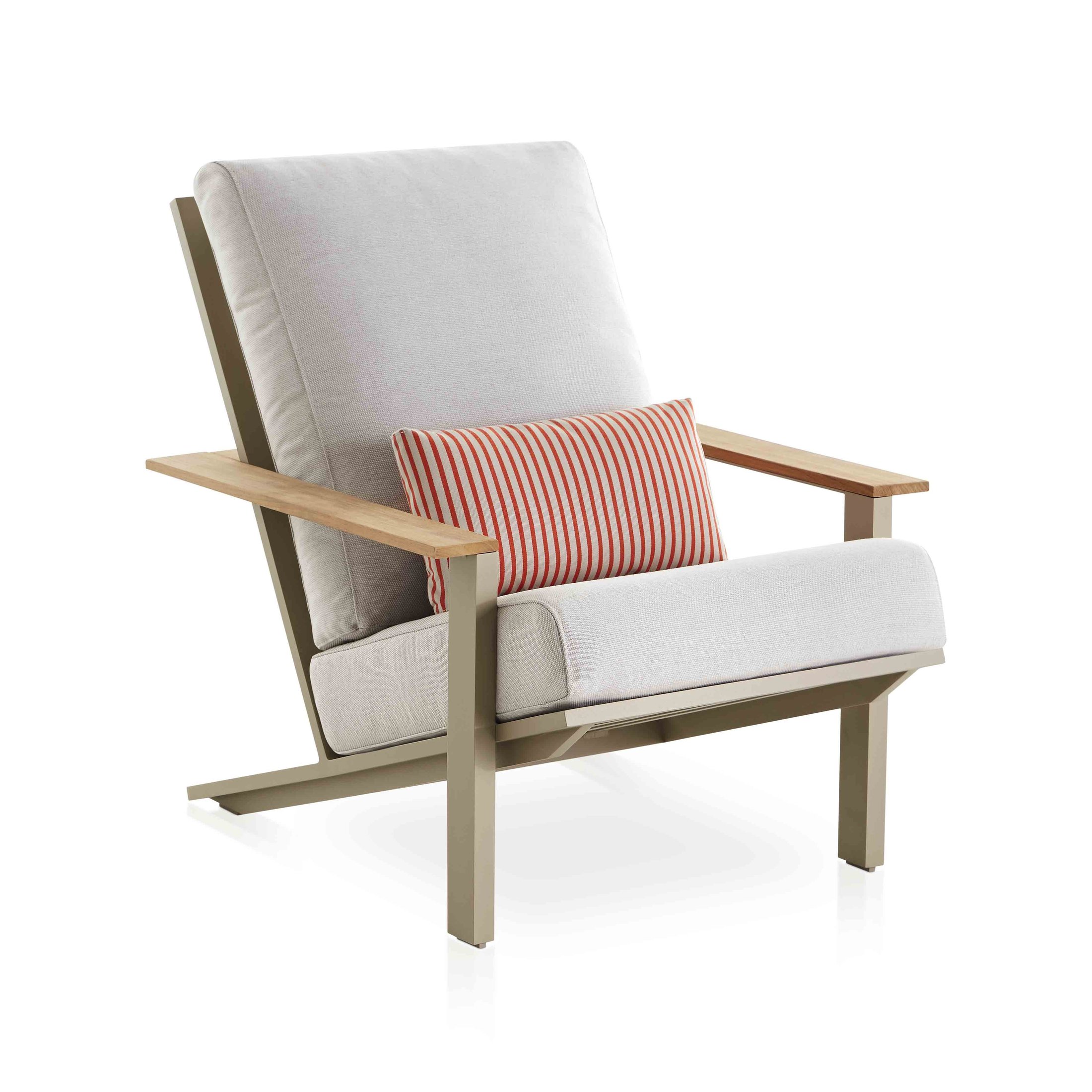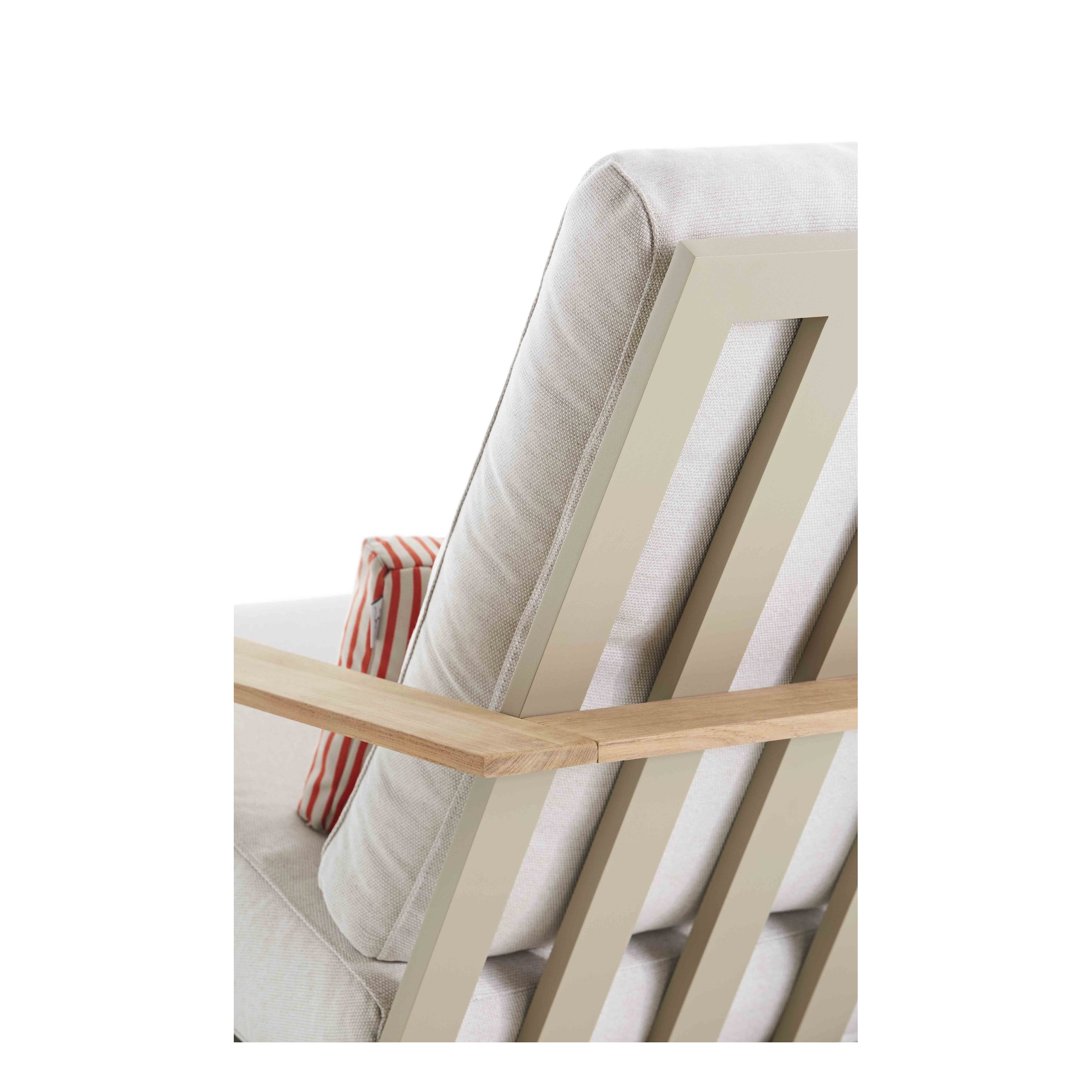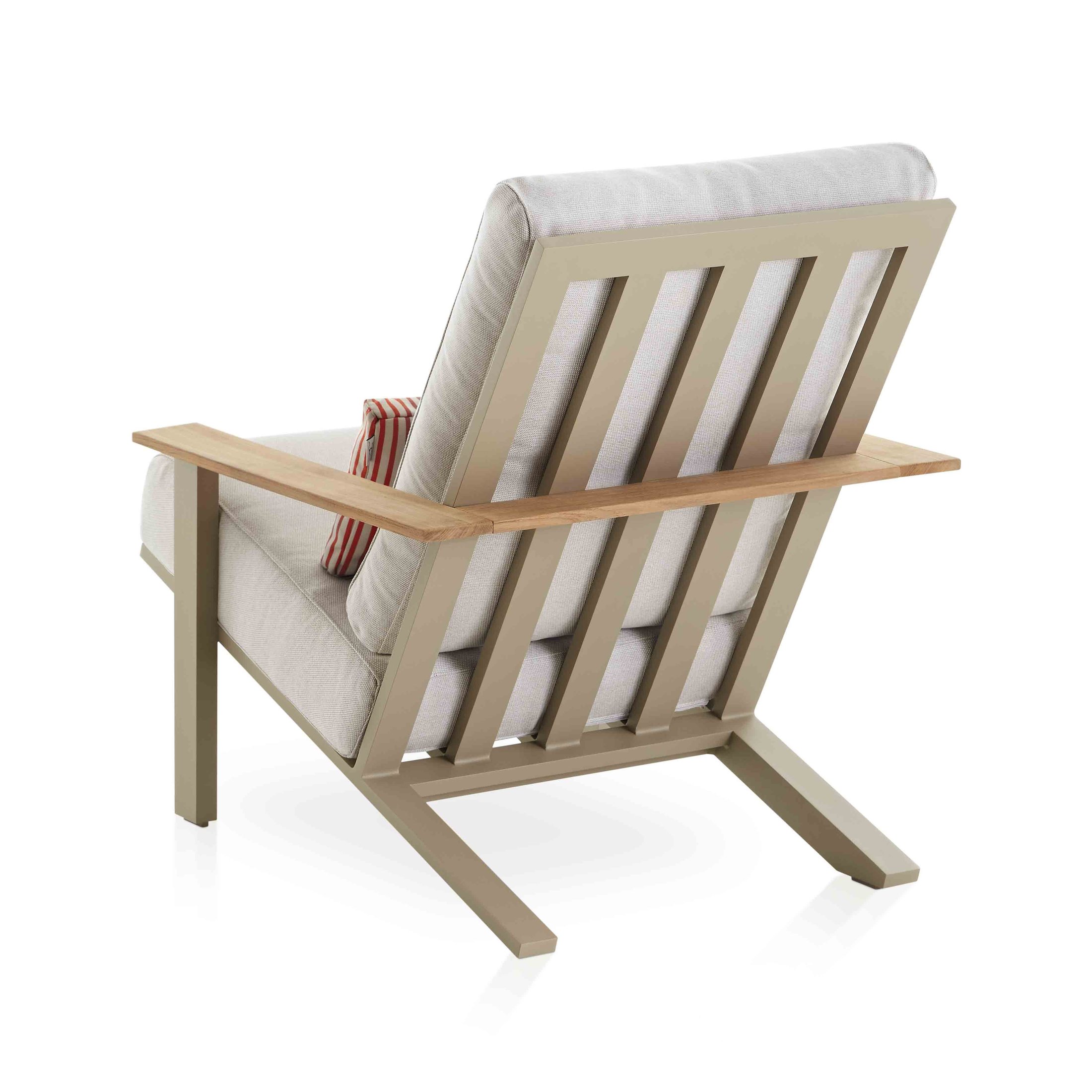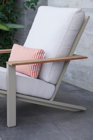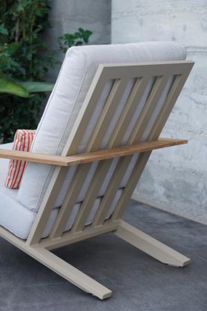 Diese neue Version des Timeless Relax Clubsessel mit Armlehne und der dazu passende Timeless Relax-Hocker sind die charaktervollsten Stücke der Kollektion. Sie zeichnen sich durch ihre Eleganz und Nüchternheit aus. Der Relax Clubsessel mit Armlehne ist ein Clubsessel für den Außenbereich, der aus handgeschweißten Aluminiumprofilen besteht und in allen pulverbeschichteten Farben der Marke erhältlich ist, von klassischen Tönen (Weiß, Anthrazit, Sand, Bronze, Zementgrau...) bis hin zu intensiven Schattierungen. Töne, die in Kombination mit den verschiedenen Polsterungsoptionen, die die Kissen und Polsterungen schmücken, jedem Außenbereich eine besondere Note und Frische verleihen.