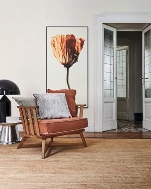 Das Gestell ist aus massiver Eiche oder Nussbaum Canaletto gefertigt – wahlweise naturbelassen, gebleicht oder in deckenden Farbtönen wie Weiß, Grau, Schwarz, Ozeanblau, Taubengrau, Blueberry, Date oder Ginger lackiert. Überkreuzte Beine sorgen für Stabilität und einen spannenden Kontrast zur weichen Kissenpolsterung.