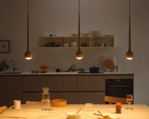 Die markante Form der Hängeleuchte Falling erinnert an einen fallenden Wassertropfen. Ob in Reihe oder zu mehreren als Lüster gehängt, Falling verströmt ein wohlig weiches Licht über dem Esstisch, dem Tresen, im Treppenauge oder im Foyer.