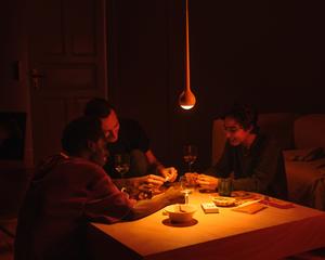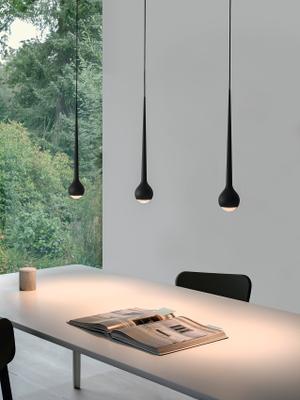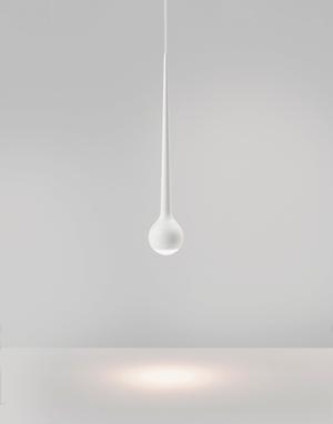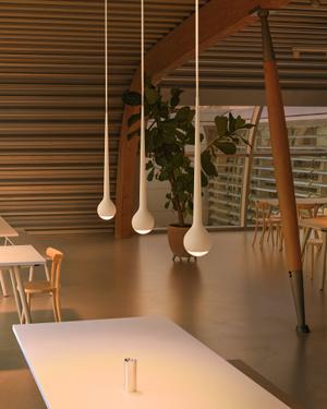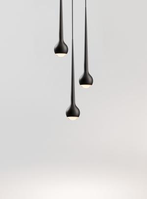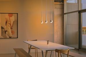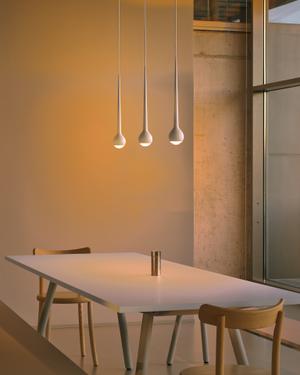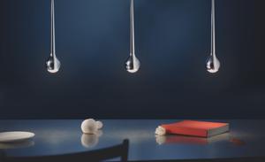 Das Design erinnert an Wassertropfen. Durch die Einzelaufhängung lassen sich zahlreiche Formen gestalten. Ob gebündelt über dem Esstisch oder als Wolke über einem Tresen oder im Foyer, Falling sorgt für perfekte Lichtstreuung. Dank der optischen Linse ist die Leuchte blendfrei. Mit Dimmung färbt sich das Licht wärmer ein.