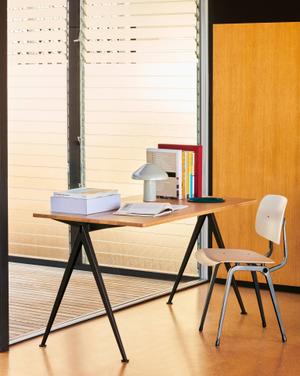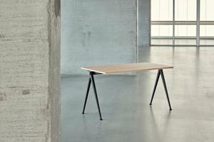 Der von Wim Rietveld entworfene Tisch Pyramid 02 zeichnet sich durch hohe Funktionalität aus. Die Tischplatte dieses Modells zeigt auch an den Enden einen Überstand zum Gestell, wodurch das Gestell in den Hintergrund tritt und der Tisch leichter wirkt.