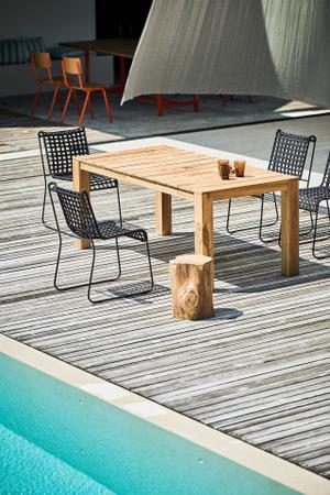 Jedes Exemplar ist durch die natürliche Maserung des wiederverwendeten Holzes ein Unikat. Das Teak stammt aus ehemaligen Bauprojekten und erhält im Tisch Stage eine neue Funktion – mit einer Patina, die Charakter und Geschichte in sich trägt. Die stabile Konstruktion sorgt für dauerhafte Nutzung im Freien. Sonne, Regen oder Temperaturwechsel meistert das robuste Holz mühelos.