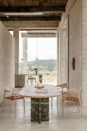 Die weich gerundete Form der Platte verleiht dem Tisch eine ruhige Linie, während die vertikal angesetzten T-Füße aus Stein für Stabilität sorgen und dem Entwurf eine feste Verankerung im Raum geben. Das Zusammenspiel von Holz und Stein schafft eine subtile Spannung, die sich unaufdringlich entfaltet.