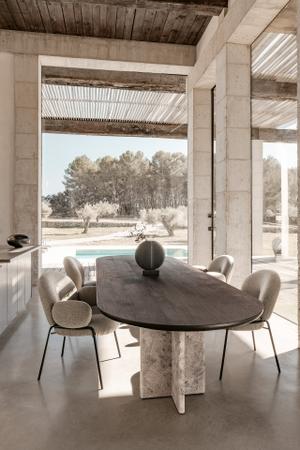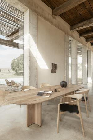Als ovaler Esstisch verbindet der BC 17 T-Rox von Janua die handwerklich gearbeitete Eichenplatte mit einer kraftvoll gestalteten Unterkonstruktion aus Naturstein – reduziert in der Sprache, präzise in der Wirkung.