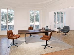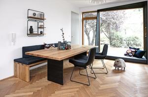 Mit Wangenfüßen aus Rohstahl und einer Platte aus Holz bietet der SC 41 eine weitere, interessante Variante der zahlreichen Janua Material-Kombinationen. Die Tischplatte ist durchgehend in ca. 4 cm gefertigt und die Wangen sind mit einem Steg verbunden.