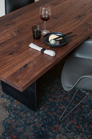 Besonders interessant ist dabei die Kombination zweier Materialien, deren Optik stark variiert: Sowohl die Maserung des Holzes wie auch die Beschaffenheit des Rohstahls lässt sich nicht genau bestimmen. So wirken beide Materialien auf einzigartige Weise ursprünglich und ergänzen sich auf natürliche Weise. Die Wangen des SC 41 Tisches sind auch in weiteren Oberflächen erhältlich: Rostbraun, RAL 9005 Tiefschwarz, RAL 9016 Verkehrsweiß, Rohstahl natur lackiert oder Aluminium eloxiert.
