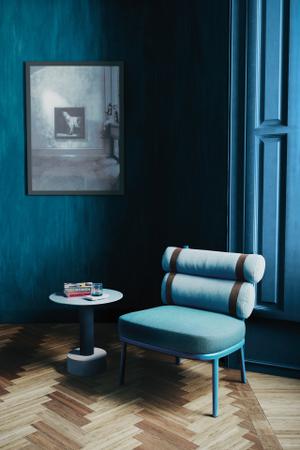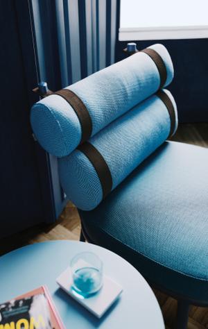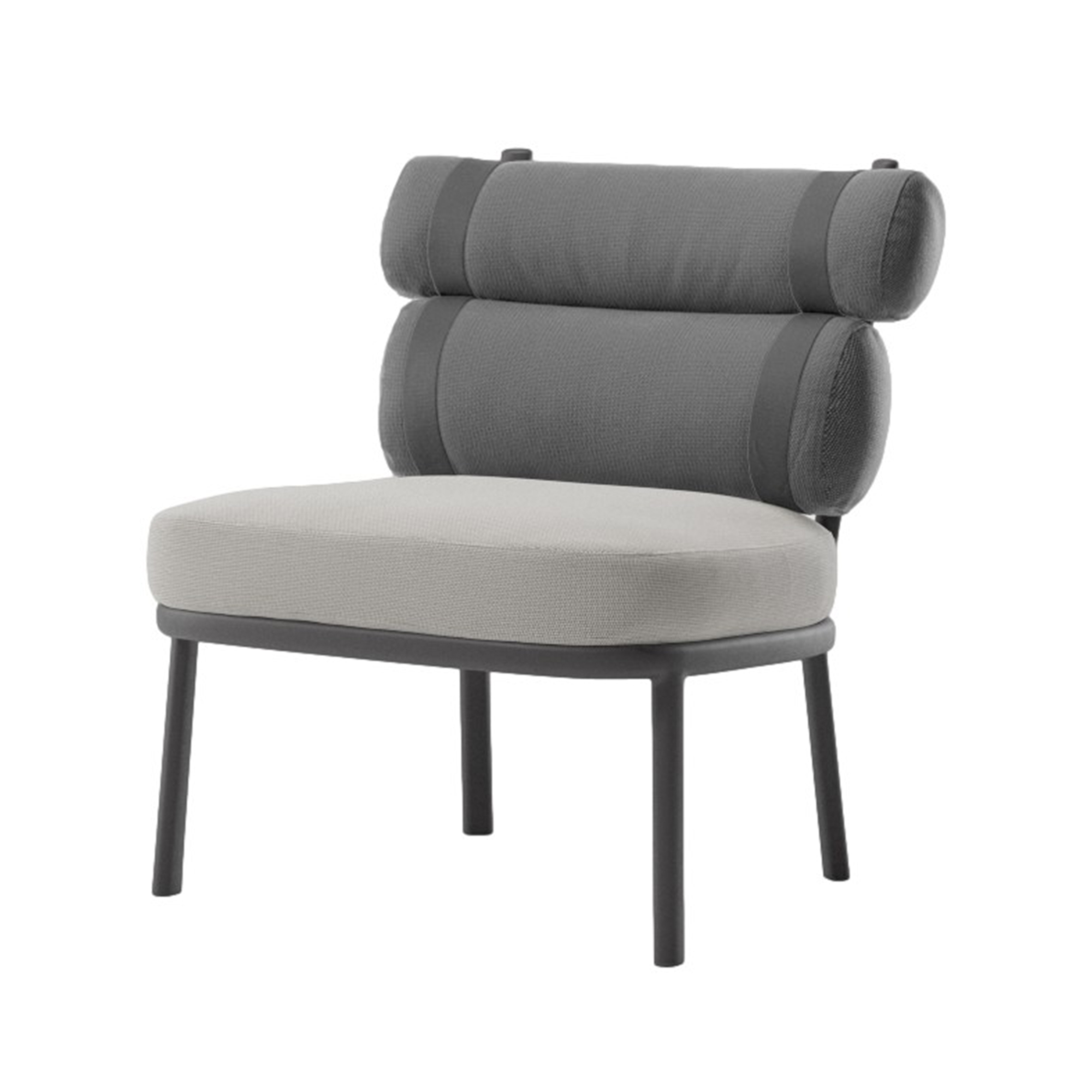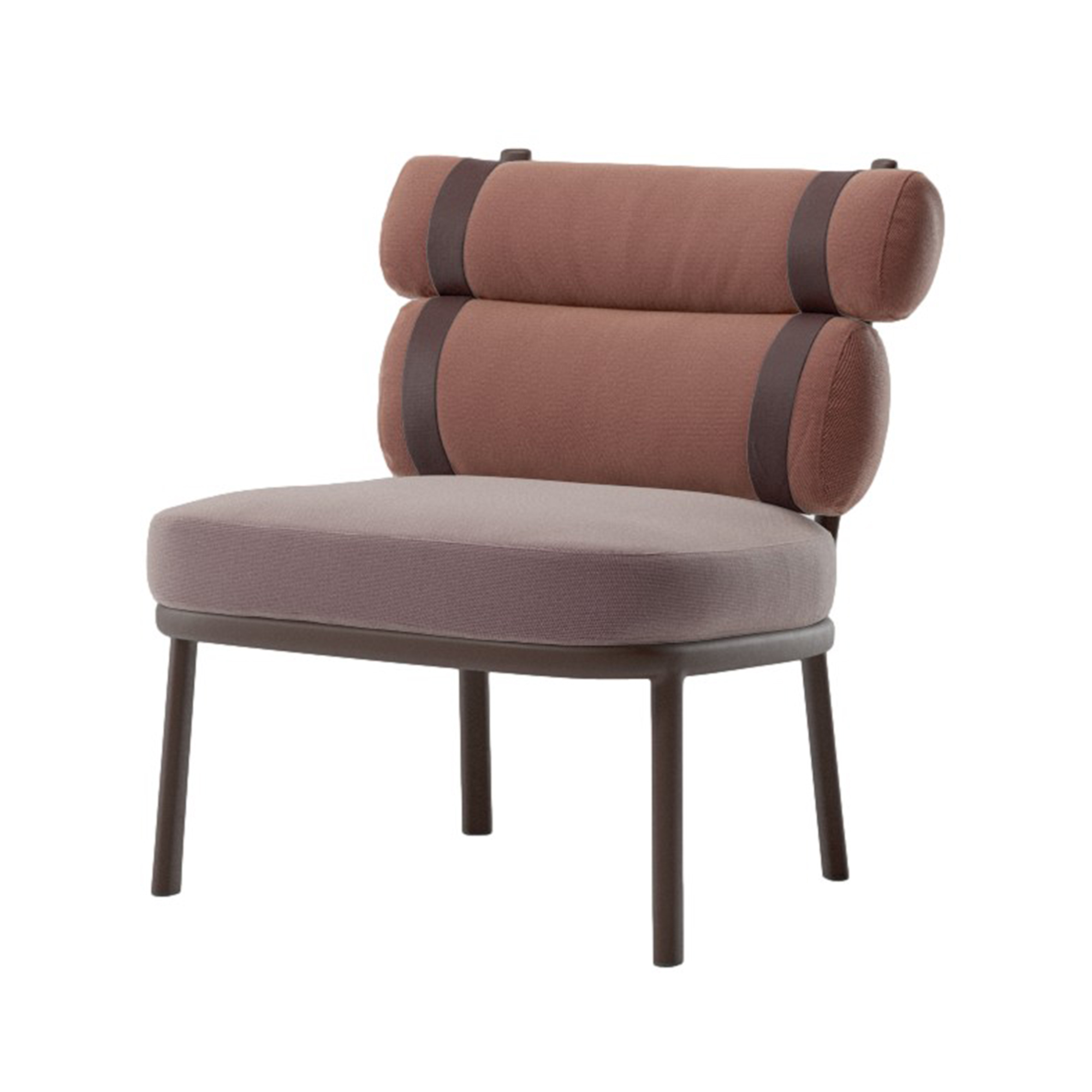 Der Clubsessel Roll von Kettal zeichnet sich durch seine innovative Rückenlehne aus, bestehend aus zwei Polsterrollen, die durch farbige Gurte verbunden sind. Diese kreative Gestaltung bietet eine interessante Alternative zur klassischen Rückenlehne.