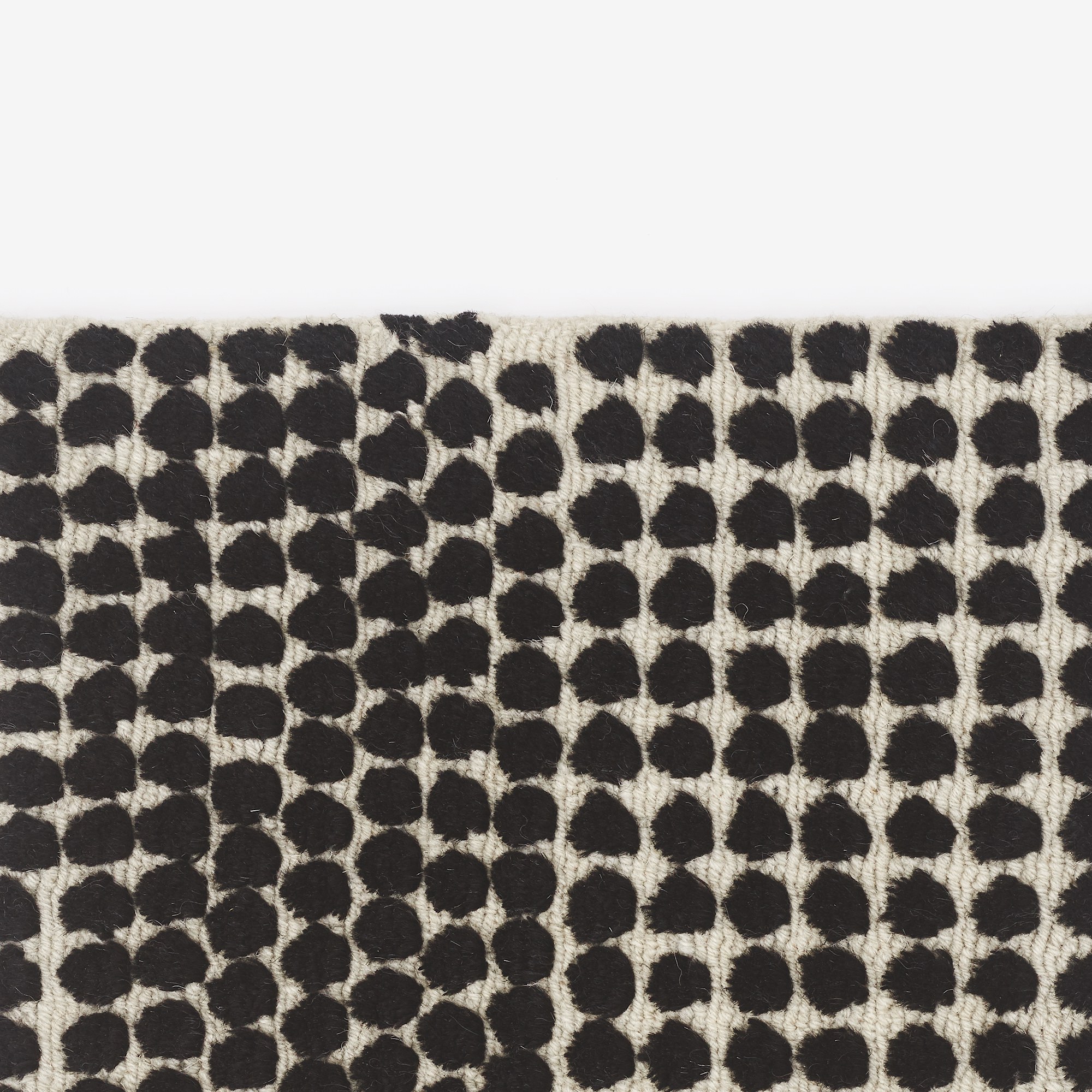 Der aus Nepal stammende Teppich Semis überzeugt mit seinem Zusammenspiel von Punkten in verschiedener Anordnung und Größe. Auch die längliche Achteckform mit unregelmäßig geschnittenen Kanten spricht für sich.