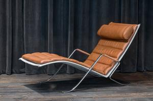 Die FK 87 Grasshopper Liege wurde 1965 von Preben Fabricius & Jørgen Kastholm entworfen und ursprünglich von Kill International in Deutschland hergestellt. Seit 2006 hat Lange Production die exklusiven Rechte an vielen FK Entwürfen