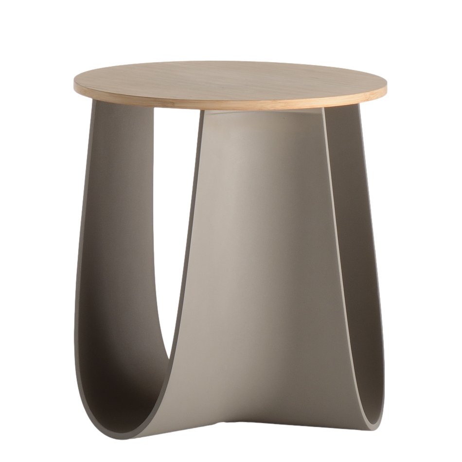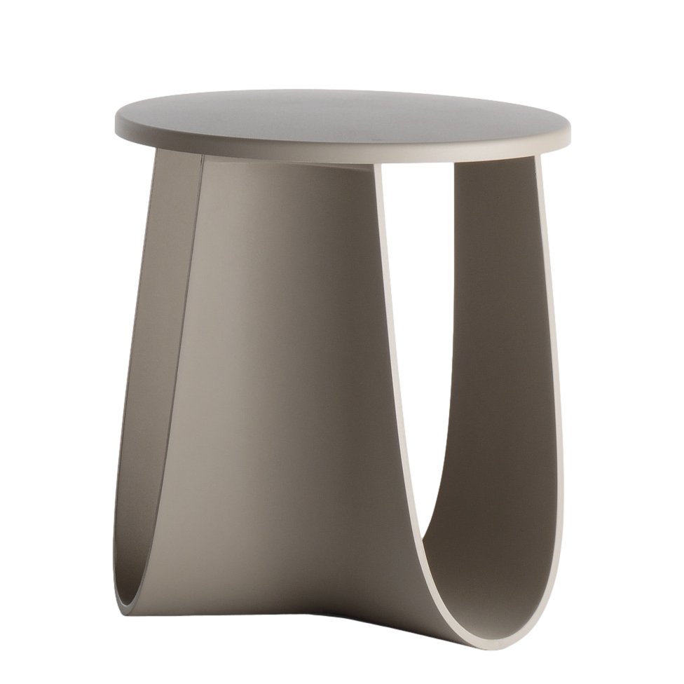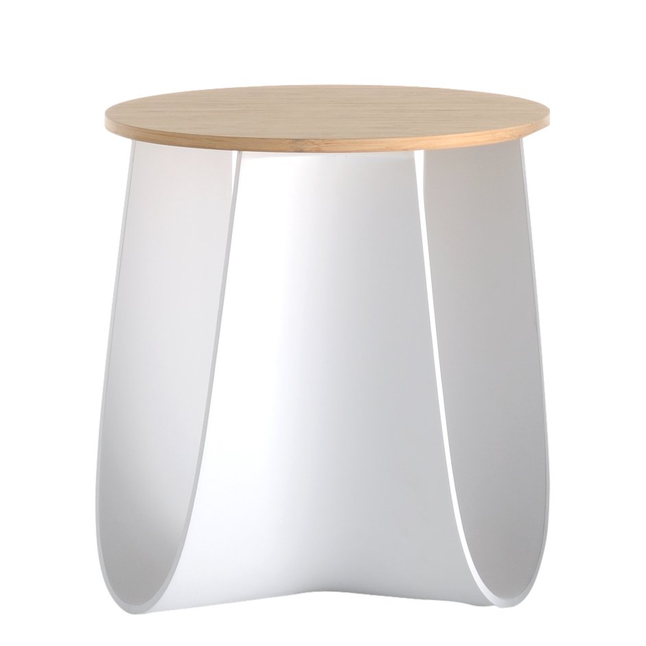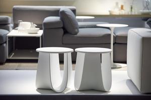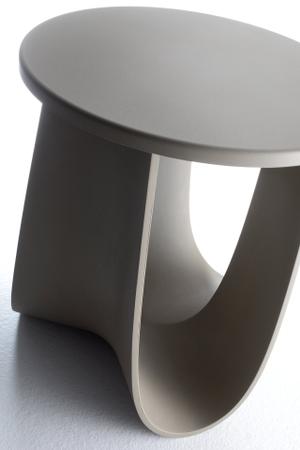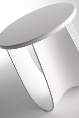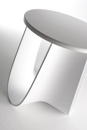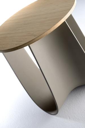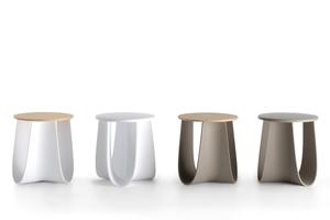 SAG kann als Hocker oder Beistelltisch genutzt werden. Besonders das Untergestell des Designobjekts fällt ins Auge. Es besteht nicht aus vier tragenden Säulen, sondern aus einem geschwungenen Ganzen, das an ein weich fallendes Stück Stoff erinnern soll.