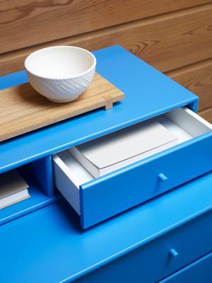 Keep ist eine Kommode mit vier großen und einer kleinen Schublade und einem offenen Fach und weißen Füßen.