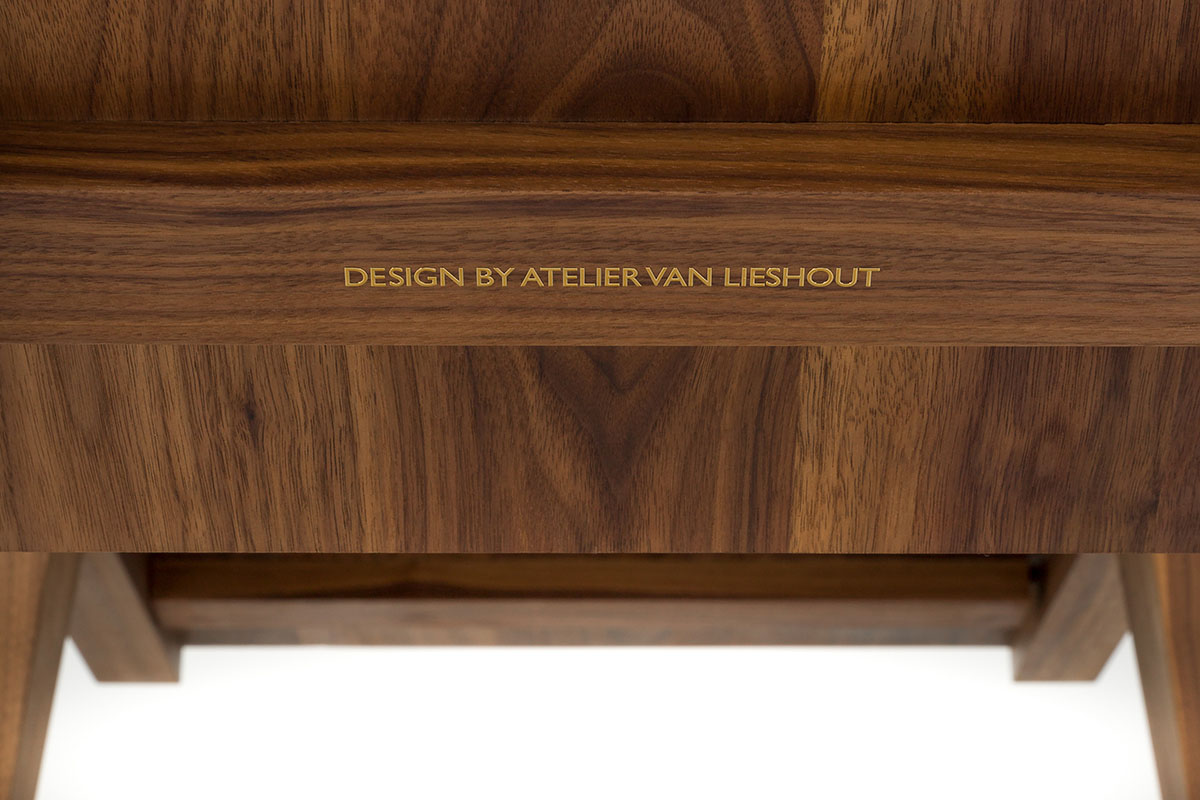 Die markante Silhouette und die asymmetrische Armlehne aus Holz machen den Lounger zu einem besonderen Objekt. Die erste Liege fertigte van Lieshout ohne Skizzen, rein intuitiv.