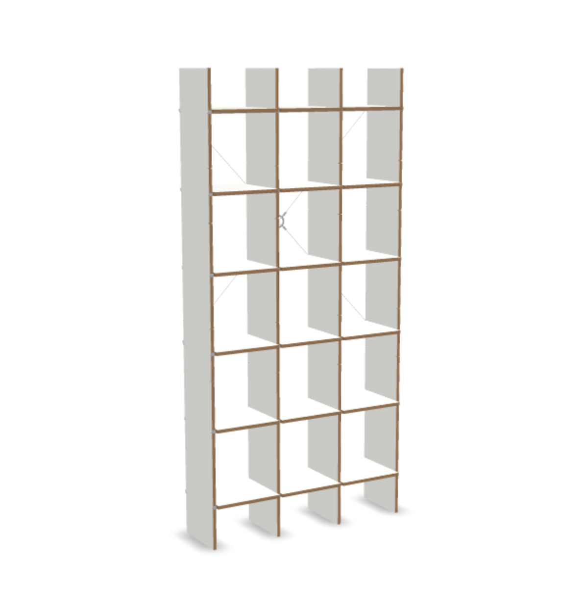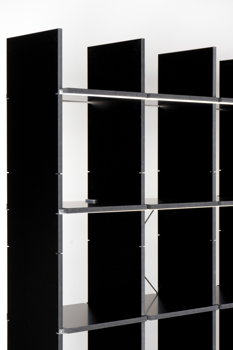 Als reine Struktur ist das Regal reduziert auf Wangen und Böden, die im Verbund mit den eingesteckten Aluminium-Schienen die Transparenz des Entwurfs in den Vordergrund stellen. FNP ist nachträglich erweiterbar und ohne Werkzeug aufzubauen.