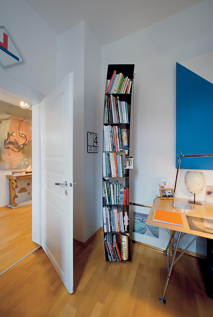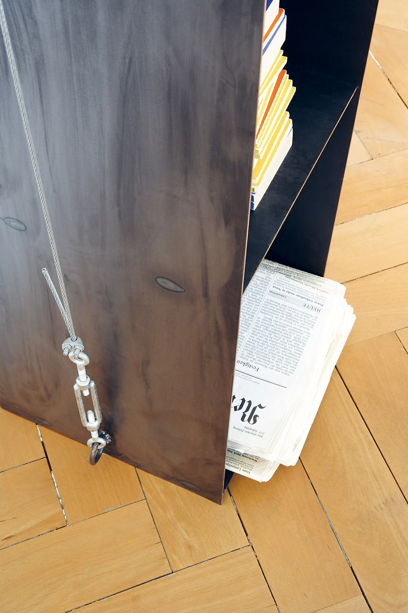 Das Design von Wolfgang Laubersheimer bietet auf sieben Fächern Platz für Bücher, Geschirr oder Deko. Die extravagante Konstruktion besteht aus hauchdünnen Stahlblechen und einem stabilisierenden Stahlseil. Als unkonventioneller Hingucker gibt das gespannte Regal jedem Interieur einen modernen Touch.