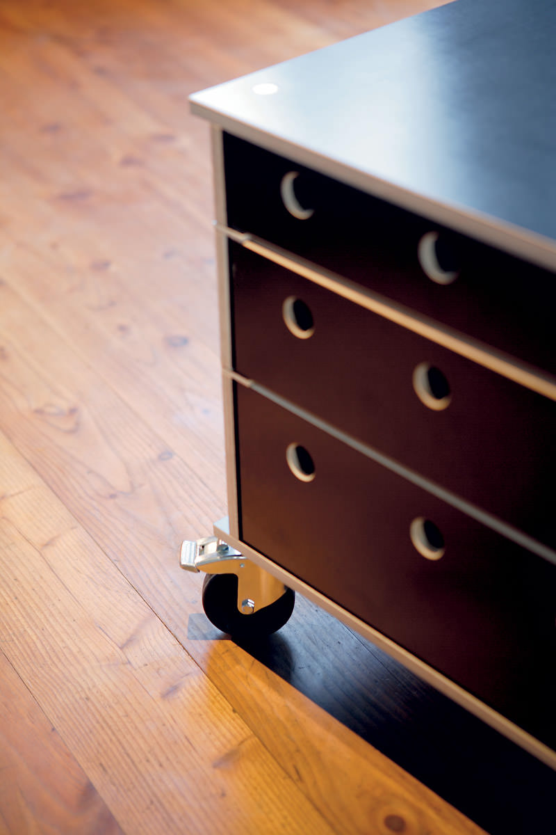 - Lader mit drei Schubkästen inklusive zwei Rollen mit Feststeller und zwei Rollen ohne Feststeller
