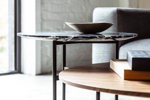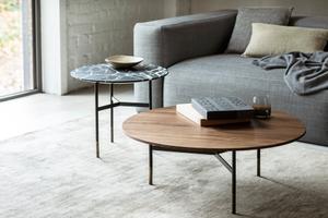 Aus der Harri Serie sind auch Beistelltische erhältlich. Jeder Tisch mit schwarzer Marmorplatte ist ein Unikat, dass von der natürlichen Marmorierung gestaltet wird. Der Tisch ist optional auch mit einer Nussbaumplatte erhältlich.