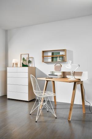Die Arbeitsplatte ist in den edlen Holzvarianten Eiche oder Nussbaum erhältlich, während der Korpus in einer nahezu unbegrenzten Auswahl an RAL-Farben lackiert werden kann. Das Gestell bietet ebenfalls Wahlfreiheit: Es ist in Eiche oder Nussbaum verfügbar oder kann farblich passend zum Korpus aus Metall gefertigt werden.