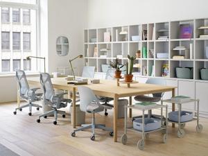 Der Flow Trolley vereint funktionales Design und Anmut. Die gerillten Schalen und das monochrome Erscheinungsbild werden durch die auffallend schlichten Rollen ergänzt, die den Flow Trolley unkompliziert in jeden Raum bewegen.