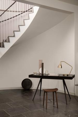 Der Schreibtisch wird von einer Fußkonstruktion aus Aluminium getragen, die in einer mattschwarzen Pulverbeschichtung erhältlich ist. Das konisch geformte Bein trifft in der Mitte unter der Tischplatte auf, was dem Tisch einen sehr leichten und eleganten Ausdruck verleiht.
