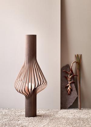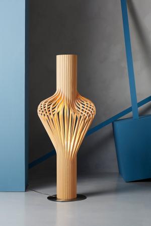 Die Leuchte Diva besteht aus 32 furnierten Sperrholzstreifen, die durch spezielle Fertigungstechniken diese ausdrucksstarke Form erhält. Das Licht wird sanft im Raum gestreut.