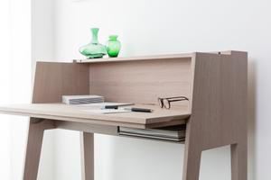 Fast könnte man meinen, hier sei die japanische Kunst des Papierfaltens in edles Holz übersetzt worden. Gleichzeitig erinnert das Möbel an Biedermeiersekretäre. Wie diese hat es einen aufklappbaren Deckel, der im geöffneten Zustand und zusammengelegt als Schreibfläche dient. Will man seine Siebensachen nicht mehr sehen, wird der Schreibtisch einfach geschlossen und steht da als diskretes Bijou.