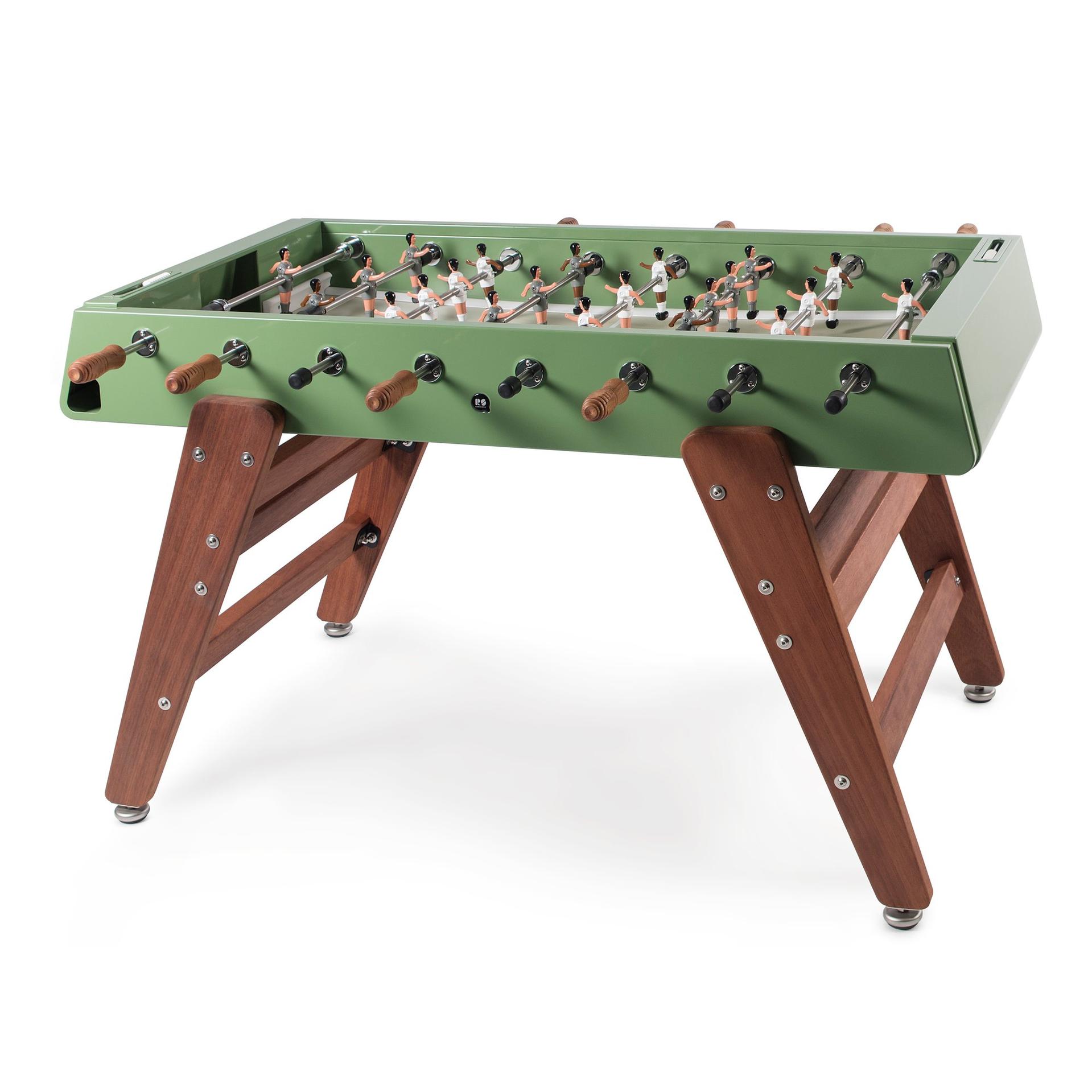 RS Barcelona verwendet für die RS3 Holz-Kickertische das strapazierfähige Iroko-Holz, dass für den Außenbereich wie geschaffen ist. Die Auswahl der Ausführungen reicht von rostfreiem Edelstahl zu Schwarz-Gold.