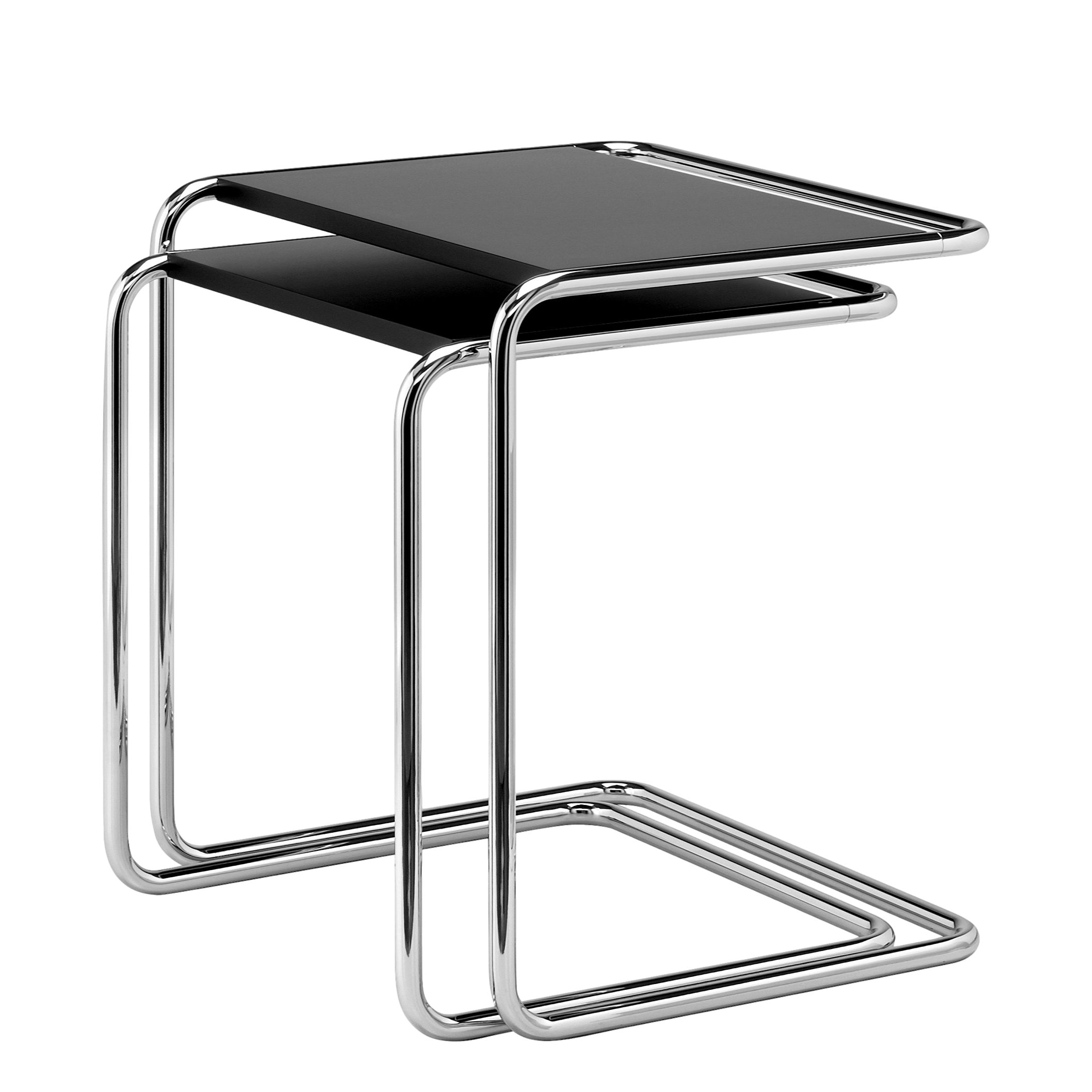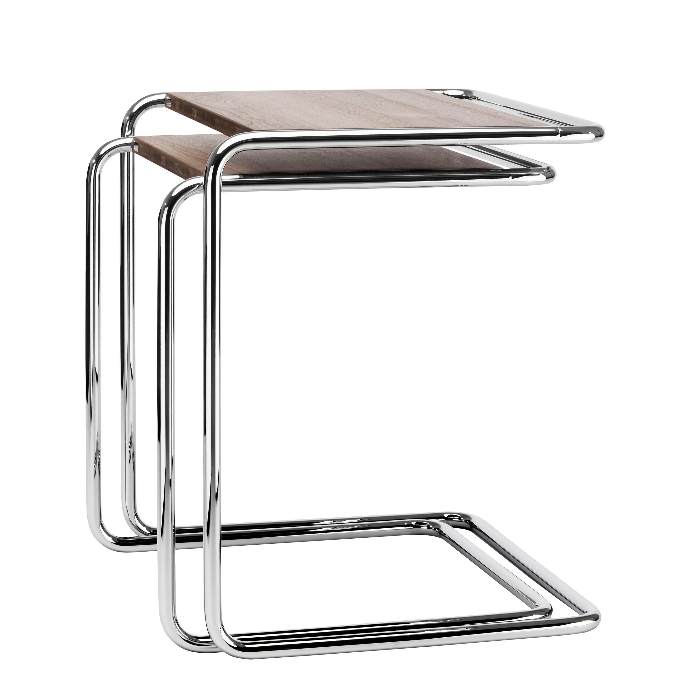 Seine veränderte Konstruktion bietet einen praktischen Vorteil. Durch die Öffnung an einer Seite kann man die Tische über den Sofa-, Sessel- oder Bettrand ziehen. Ansonsten werden sie platzsparend eng ineinander geschoben. Ein Entwurf von Thonet aus dem Jahr 1933. Er zählt zu den Klassikern der Stahlrohrmöbel.
