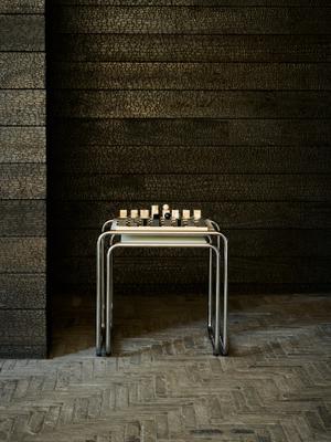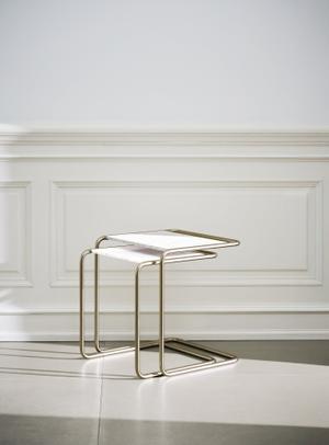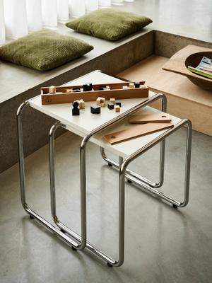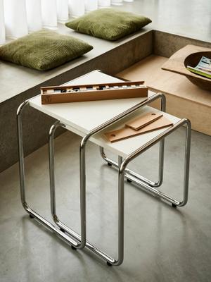 Seine veränderte Konstruktion bietet einen praktischen Vorteil. Durch die Öffnung an einer Seite kann man die Tische über den Sofa-, Sessel- oder Bettrand ziehen. Ansonsten werden sie platzsparend eng ineinander geschoben. Ein Entwurf von Thonet aus dem Jahr 1933. Er zählt zu den Klassikern der Stahlrohrmöbel.