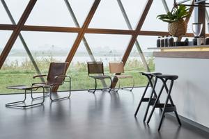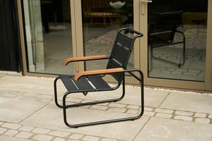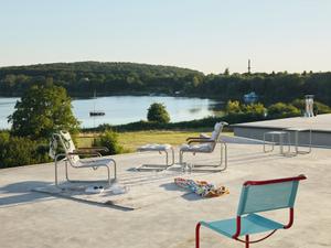 Mit dem S 35 ist es Marcel Breuer gelungen, alle Funktionen eines frei schwingenden Stahlrohrsessels in der Konstruktion einer einzigen durchgehenden Linie aufzunehmen. Dadurch entstand eine Dopplung des Freischwinger-Effekts, denn die unabhängig vom Sitz federnden Armlehnen balancieren das Schwingen des nach hinten auskragenden Sitz- und Rückengestells aus. Dazu gibt es einen passenden Fußhocker.