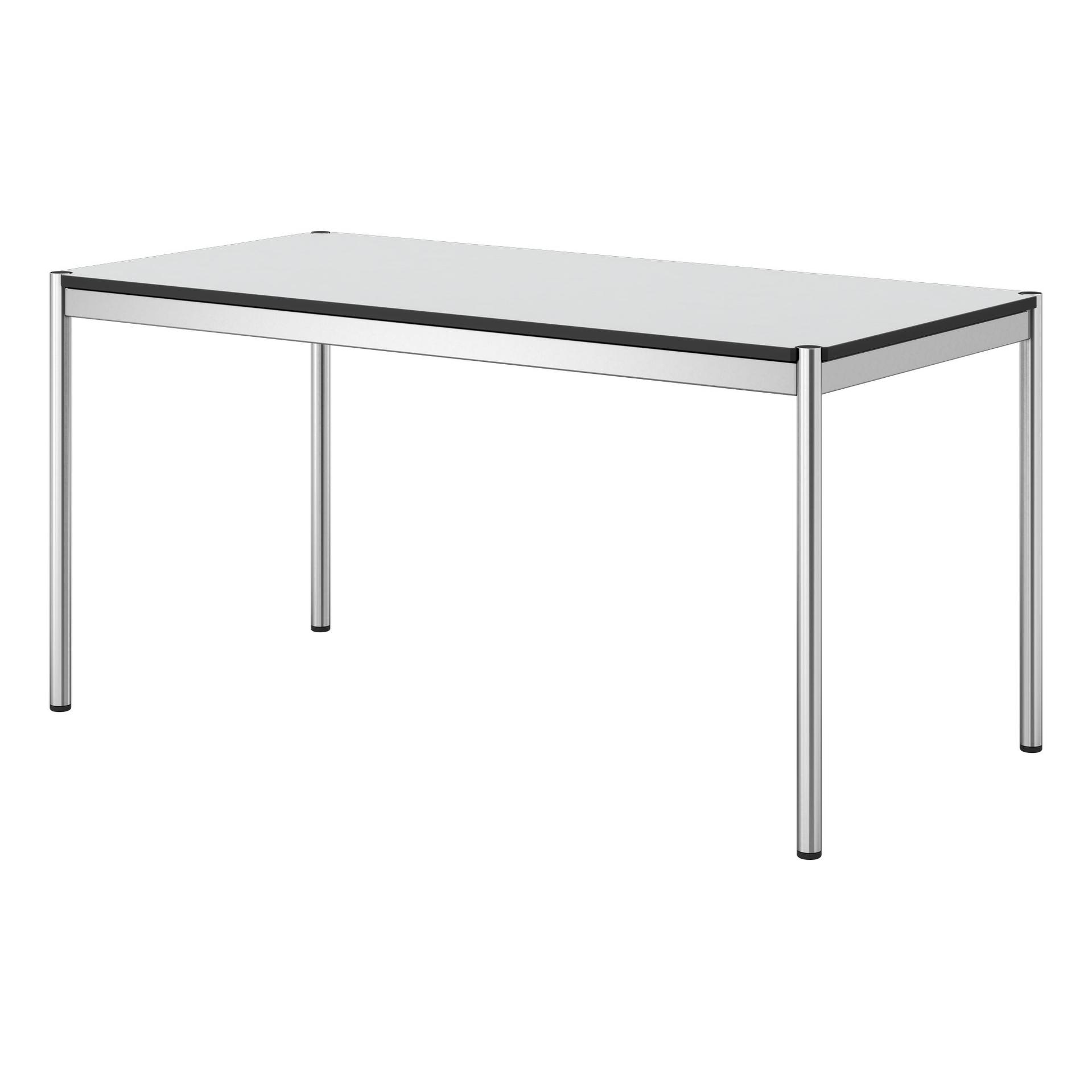 Der Tisch von USM. Rechteckig, mit verchromtem Gestell und mit drei verschiedenen Tischplatten wählbar.