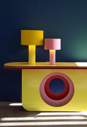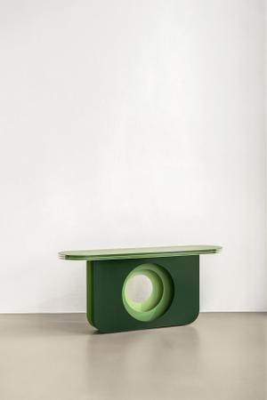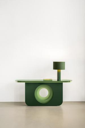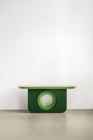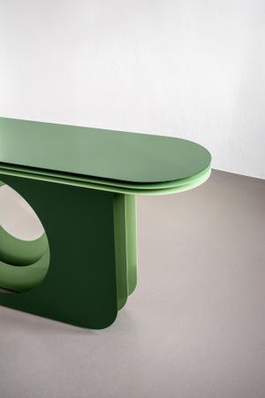 Platte und Fuß bilden formal ein seitlich erkennbares T-Profil, die Frontalansicht hingegen bringt die weichen Figuren von Oval, Kreis und abgerundetem Quadrat zusammen. Charakterisiert wird My Ami aber vor allem durch seine klaren Farben. Zwei Varianten im harmonischen Dreiklang stehen zur Wahl: Multi in gelb, rosa und blutorange sowie Grün in dunkelgrün, reseda und lindgrün.