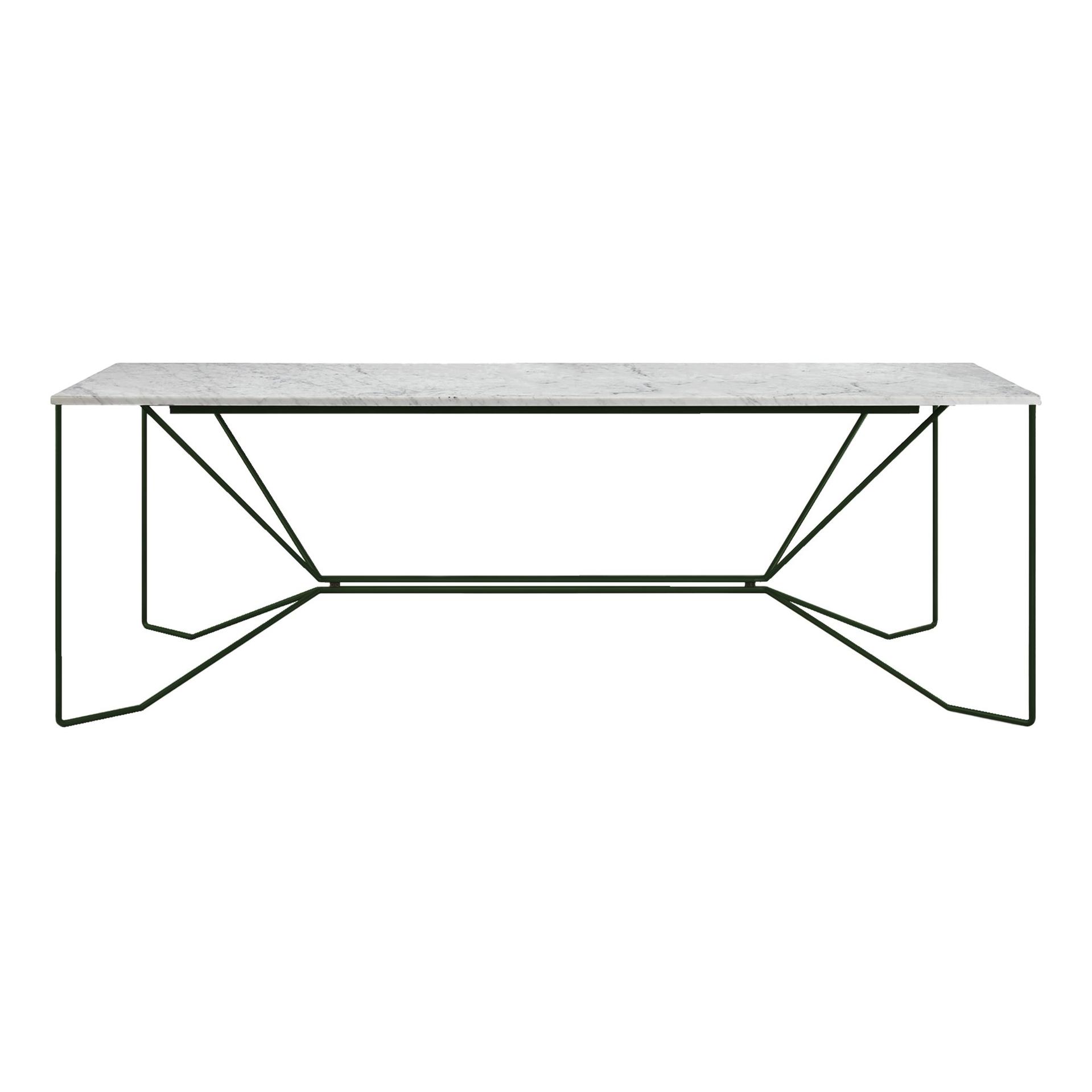Wenn das filgrane Gestell des Same Same Tisches eine Steinplatte trägt, kann der Kontrast nicht stärker sein. Die Platte wird auf dem Gestell verschraubt und durch einen Stahlrahmen verstärkt.