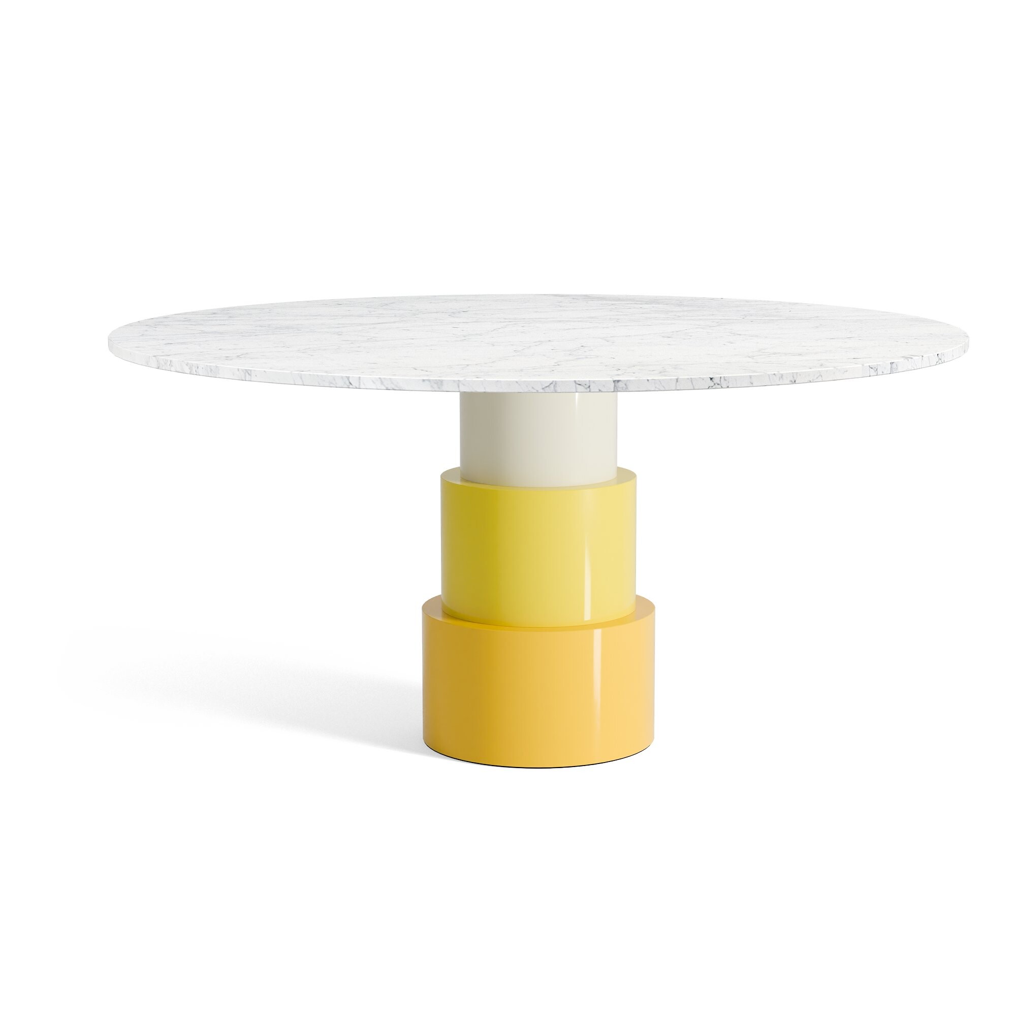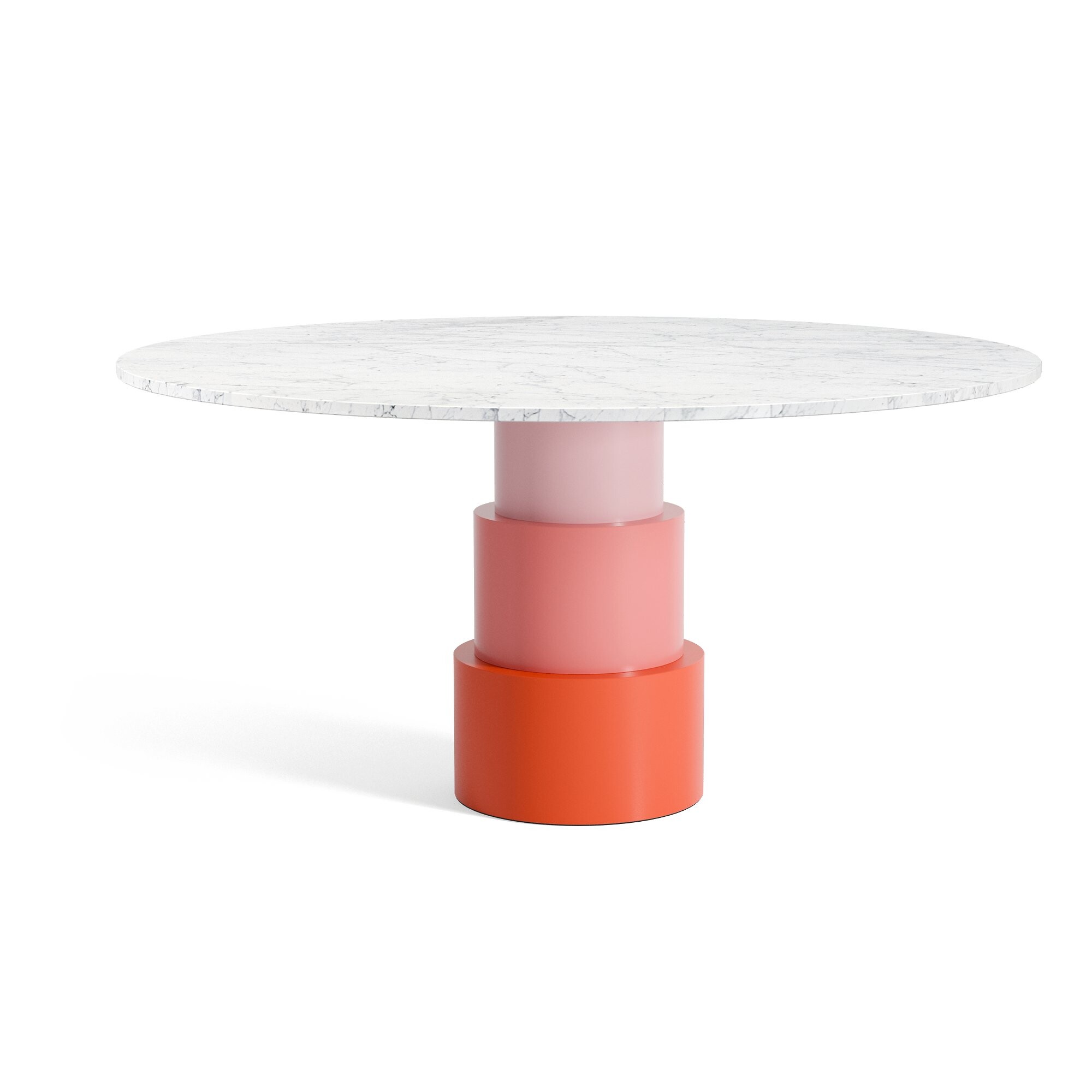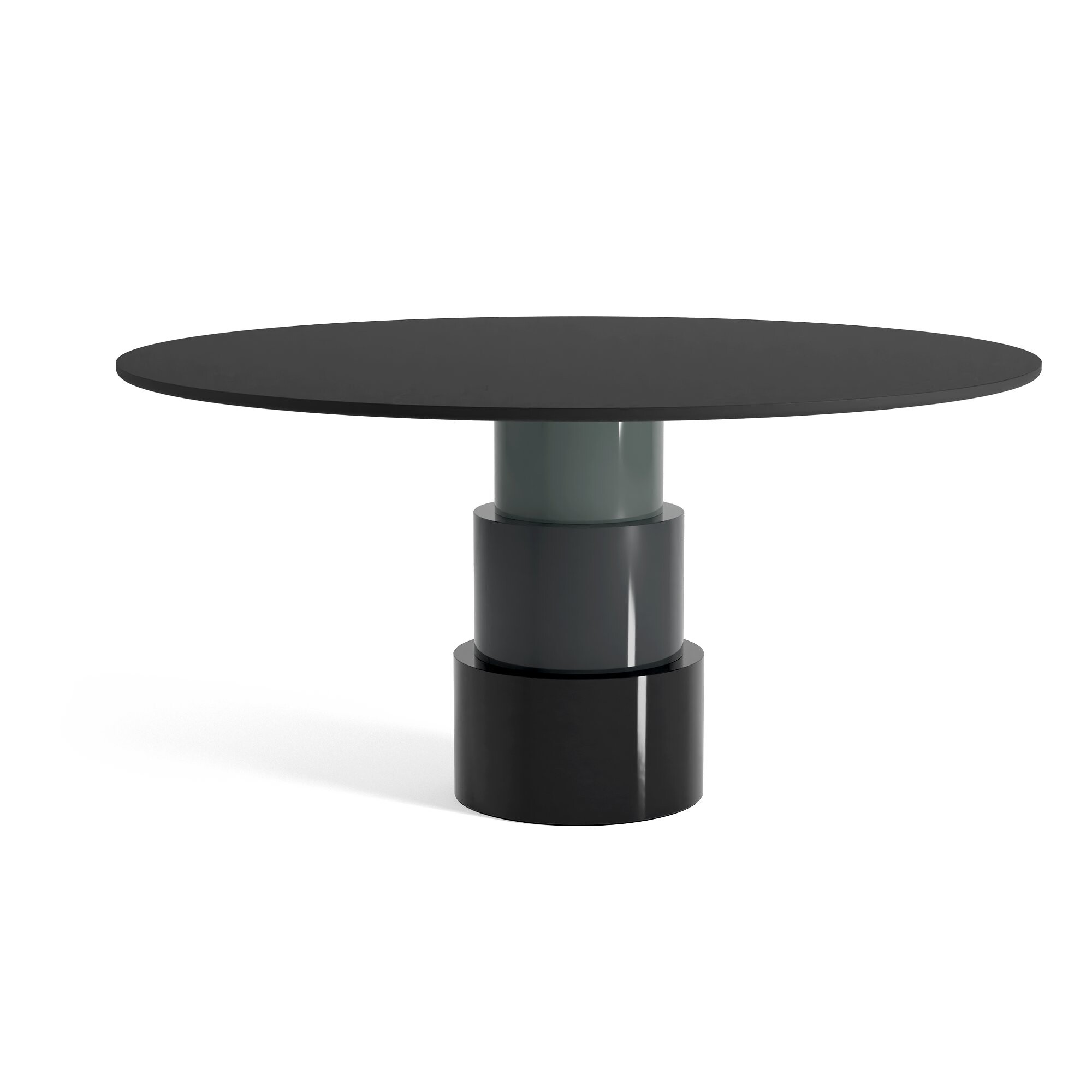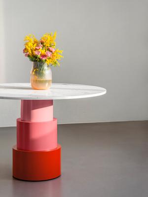 Die sechs Farbvarianten der Basis bilden in Kombination mit den Platten ein monochromes Ganzes und verleihen dem Tisch je nach Ausführung eine ruhige oder lebendige Wirkung.