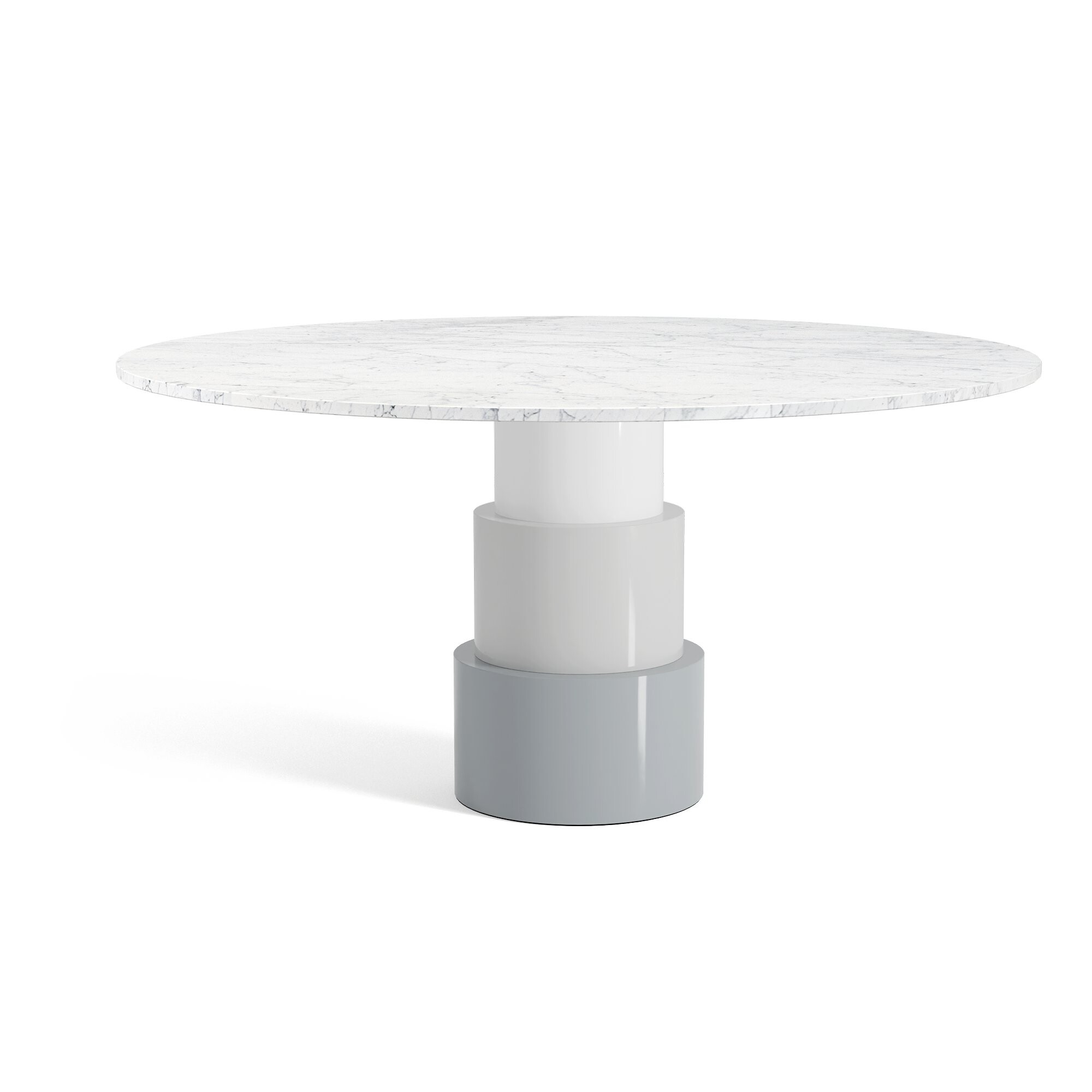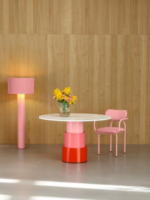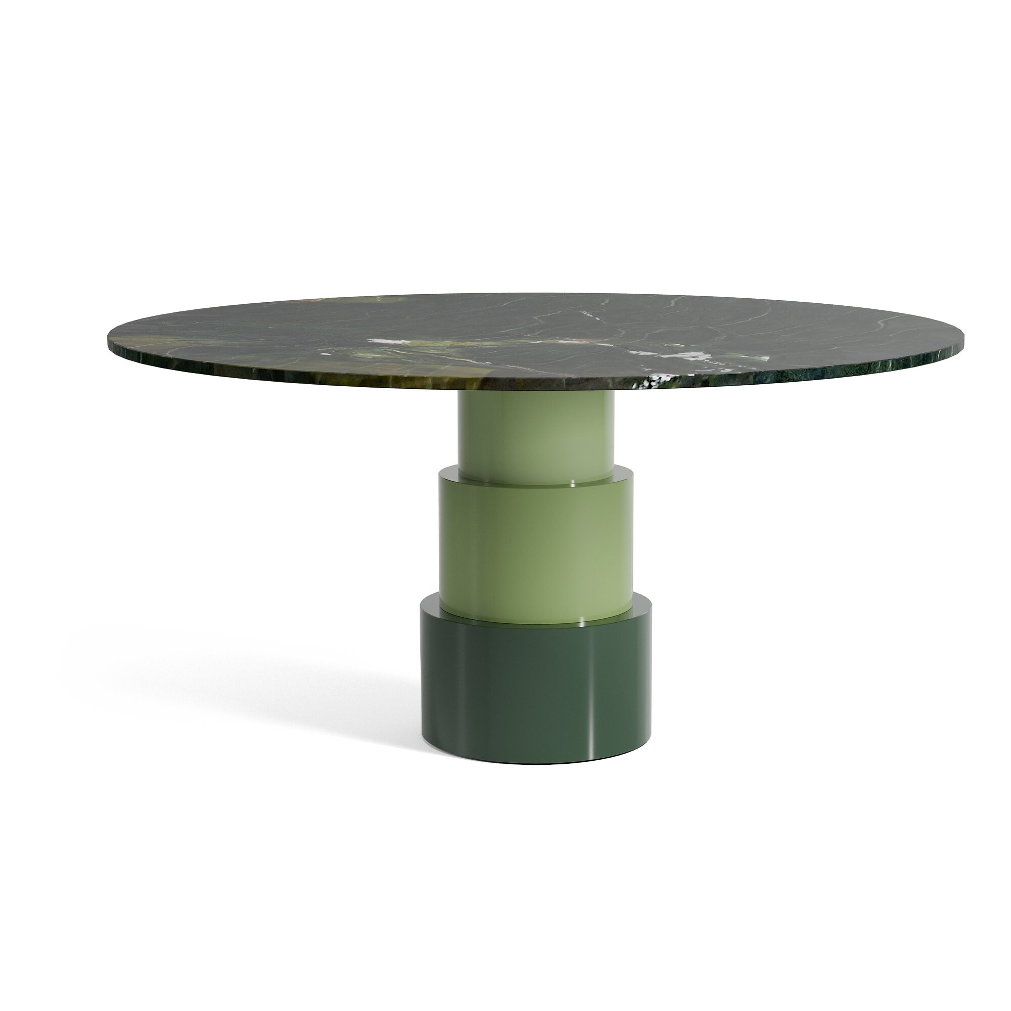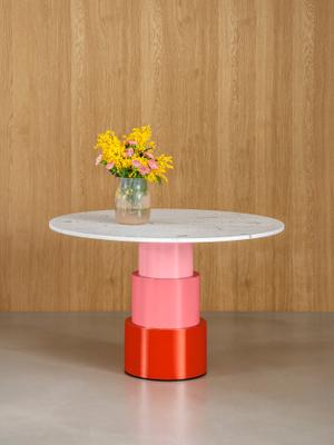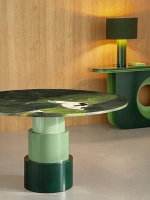 Die sechs Farbvarianten der Basis bilden in Kombination mit den Platten ein monochromes Ganzes und verleihen dem Tisch je nach Ausführung eine ruhige oder lebendige Wirkung.