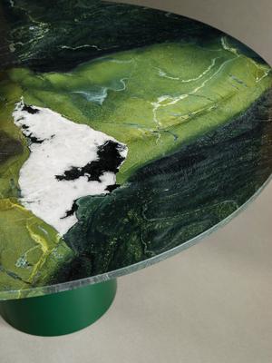 Der Tisch U Turn überzeugt mit einer klaren, markanten Silhouette. Seine Basis besteht aus drei konisch zulaufenden Zylindern, die an gestapelte Steine erinnern und dem Entwurf eine skulpturale Präsenz verleihen. Darüber scheint die nur 20 Millimeter dünne Platte förmlich zu schweben – stabilisiert durch eine verborgene Metallkonstruktion.