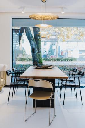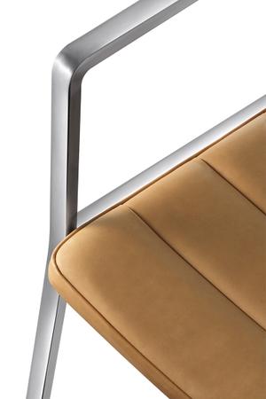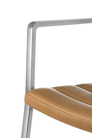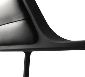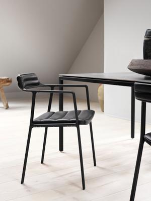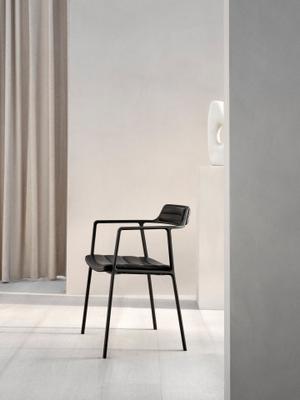 Das schwarze, pulverbeschichtete Aluminiumgestell verschmilzt optisch mit den lederbezogenen Sitz- und Rückenpolstern des neuen Stuhls von Vipp. Dadurch entsteht ein einheitliches und schlichtes Bild, wodurch sich dieser Armlehnstuhl gekonnt in jede Umgebung einfügt. Durch das zarte Gestell und die schmale Rückenlehne gewinnt der Stuhl an Leichtigkeit und kann somit im Essbereich oder auch im Wohnbereich punkten. Die Polsterung ist in Leder, Wolle und Polyester erhältlich, wodurch die Optik flexibel an den Wohnraum angepasst werden kann.
