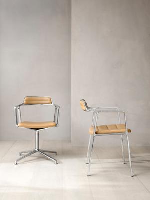 Der erste Armlehnstuhl von Vipp verfügt mit seinem schlichten Design und dem schmalen Gestell über ein zeitloses und dennoch modernes Aussehen. Die für Vipp typische, schwarz pulverbeschichtete Oberfläche wurde erstmals mit textilen Stoffen kombiniert.