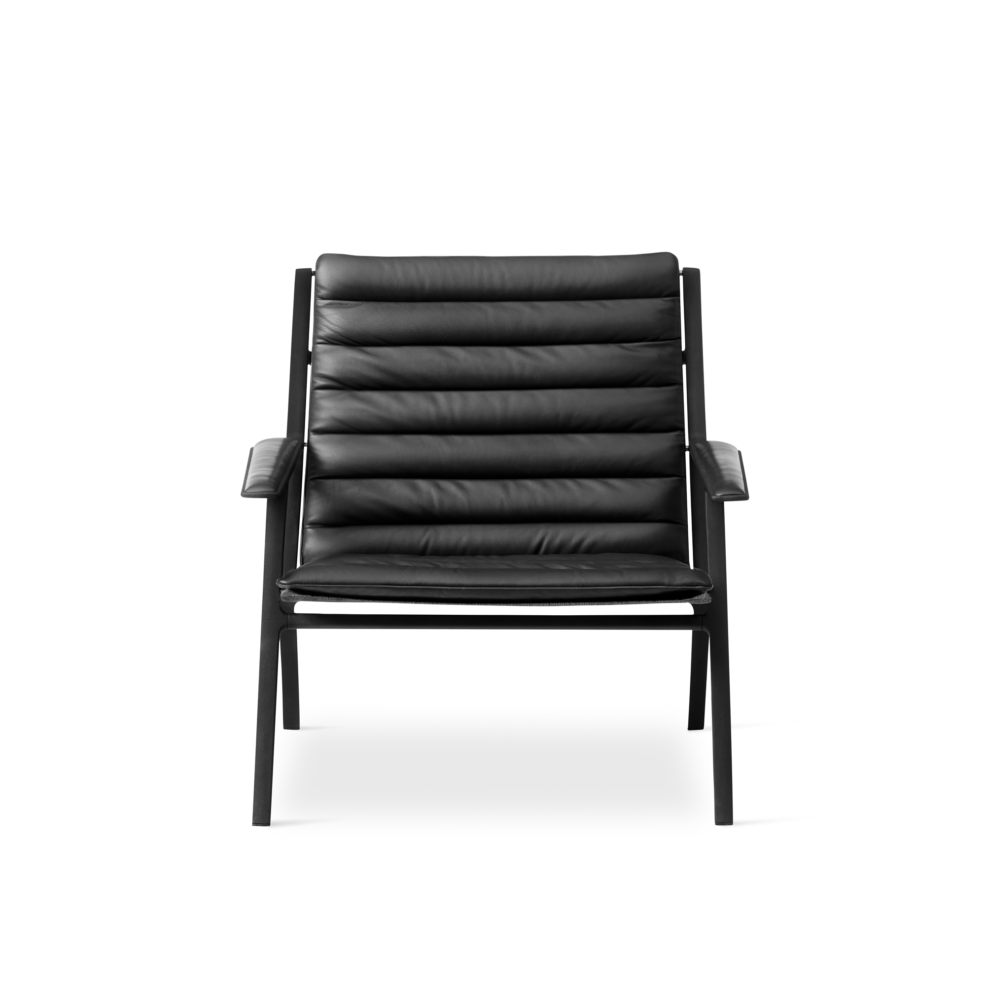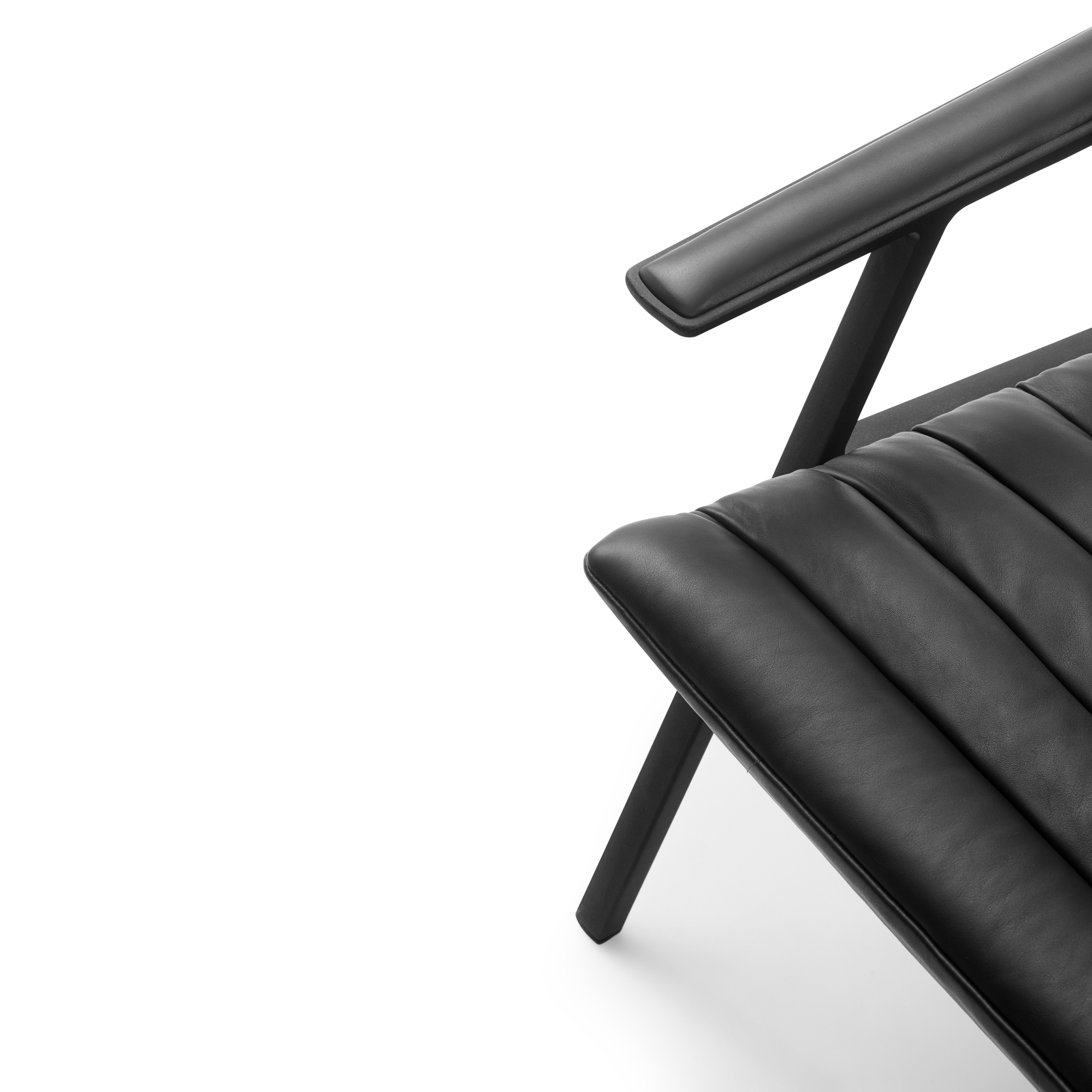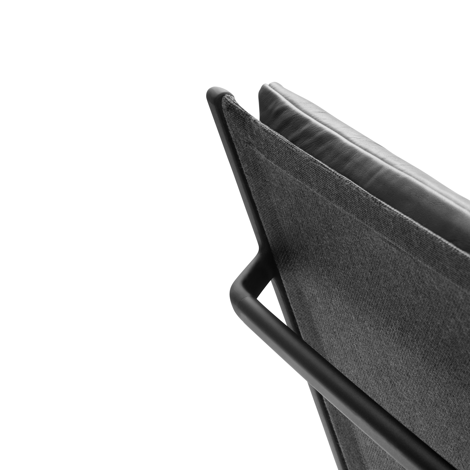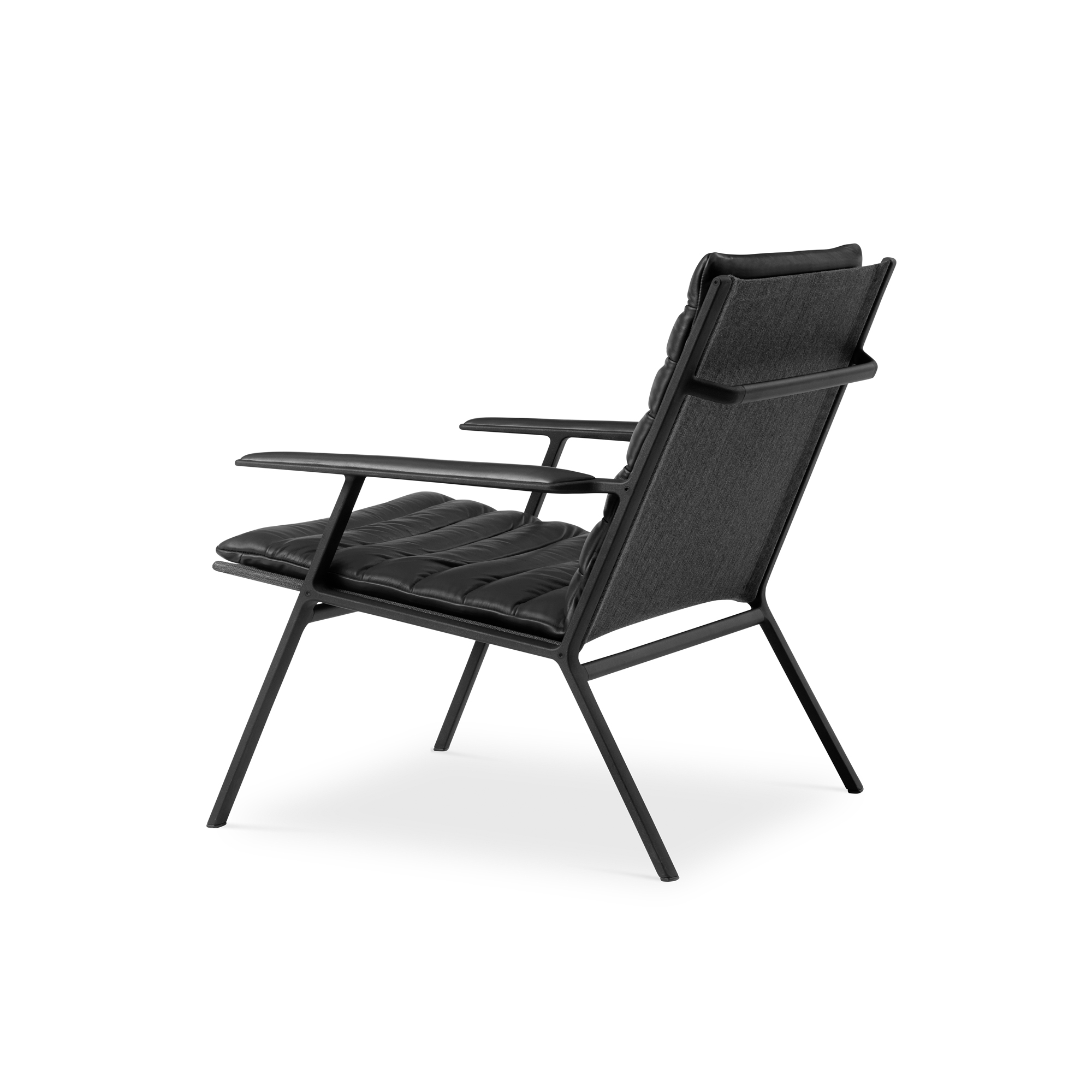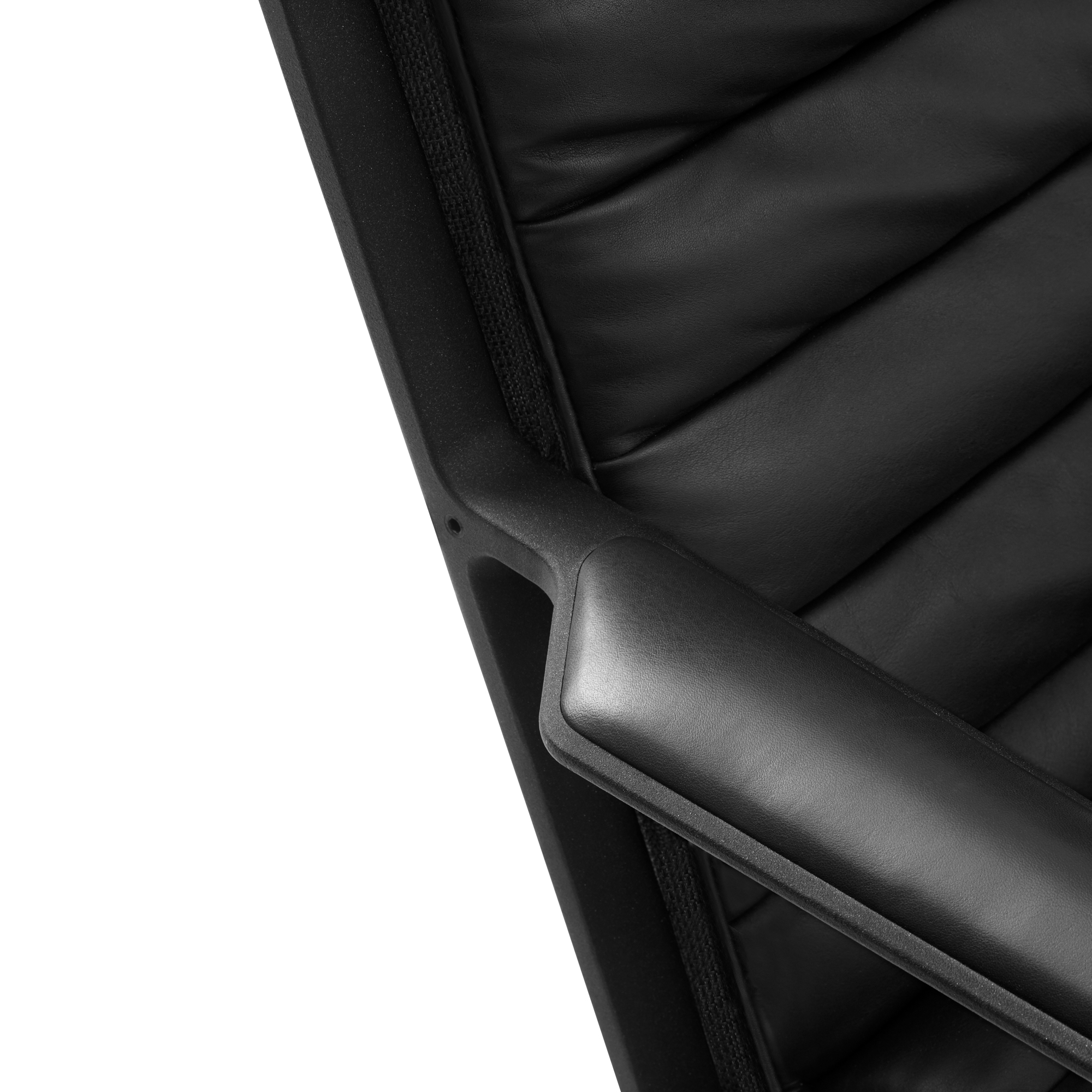 Der Loungesessel Vipp ist ideal für das Wohnzimmer oder den Loungebereich. Er verfügt über ein pulverbeschichtetes Aluminiumgestell, gepolsterte Armlehnen sowie eine leicht abgewinkelte Sitzfläche und Rückenlehne. Abgerundete Kanten und ein glatter, schwarzer Lederbezug verleihen der robusten Druckgusskonstruktion eine weiche Note, wobei die Lederpolsterung einzigartige optische Merkmale aufweist.