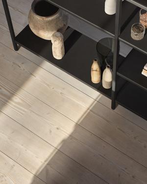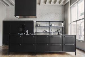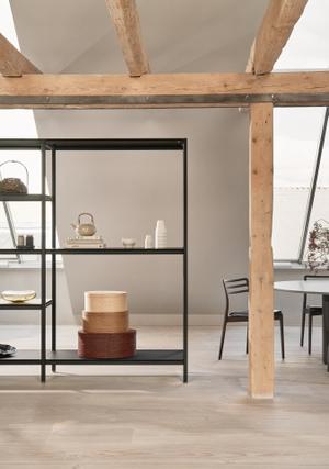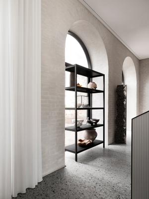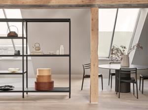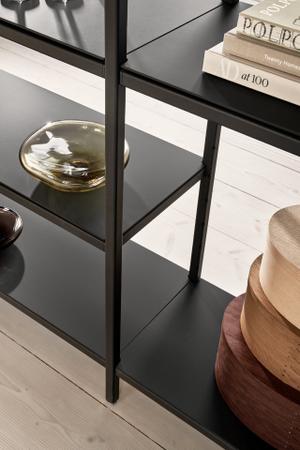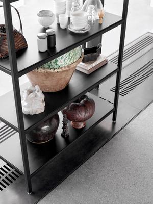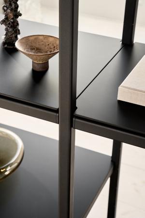 Das hohe Regalsystem, mit einer Höhe entsprechend der hohen Ausführung der Vipp Küchenmodule (Tall Modules), verleiht dem Stauraum in Ihrer Küche Leichtigkeit. Die schwarzen Böden schweben nahtlos neben dem Rahmen und verleihen dem stabilen Regalsystem eine leichte Wirkung.