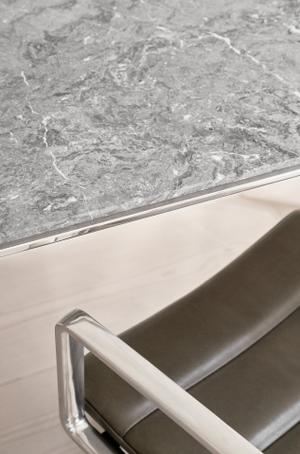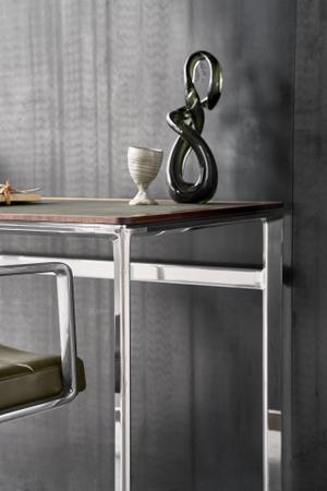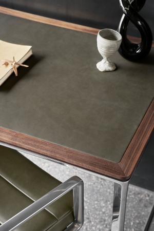 Sein Gestell aus poliertem Aluminium verleiht dem Tisch Stabilität und eine zeitgemäße Optik. Die Tischplatte ist in zwei edlen Varianten erhältlich: Marmor, das natürliche Eleganz ausstrahlt, oder Leder, das mit seiner weichen Haptik und warmen Anmutung überzeugt. Beide Materialien unterstreichen die Liebe zum Detail und die Sorgfalt, die in die Fertigung dieses Möbels eingeflossen sind.