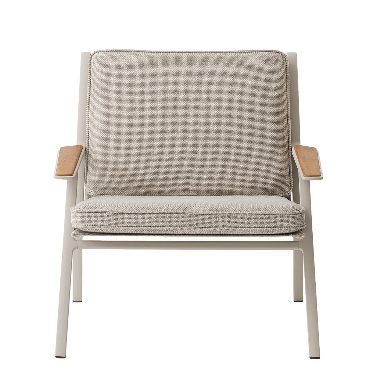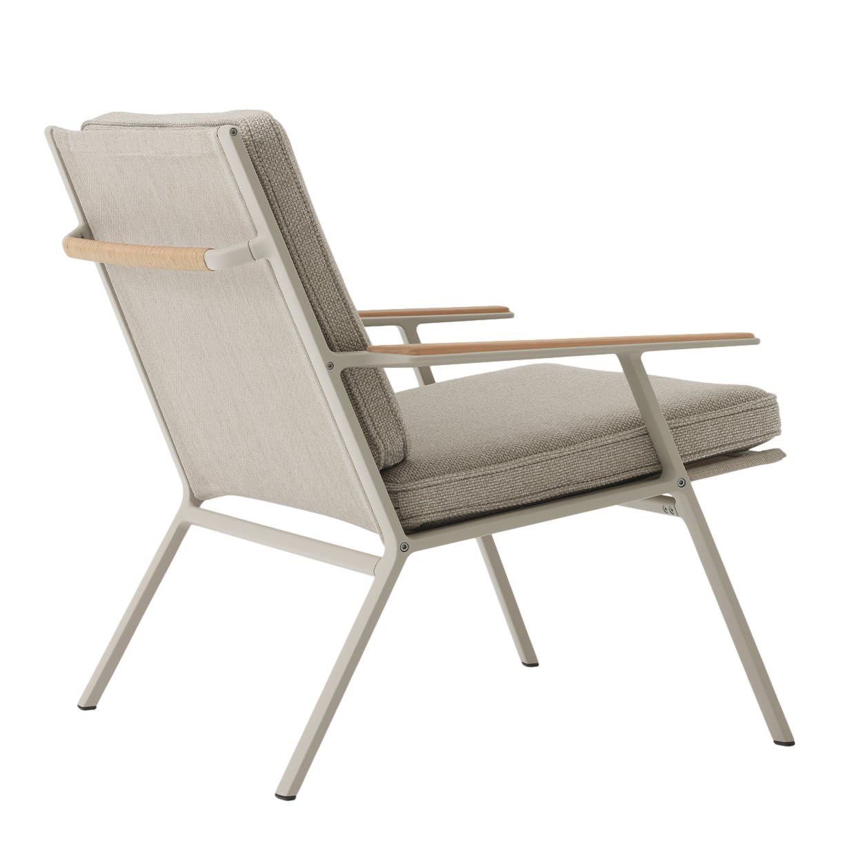 Die Bespannung des Alumminiumrahmens sorgt für maximalen Sitzkomfort. Das Teakholz entwickelt im Laufe der Zeit eine natürliche Patina und harmoniert dann perfekt mit dem Farbton des Bezugs.